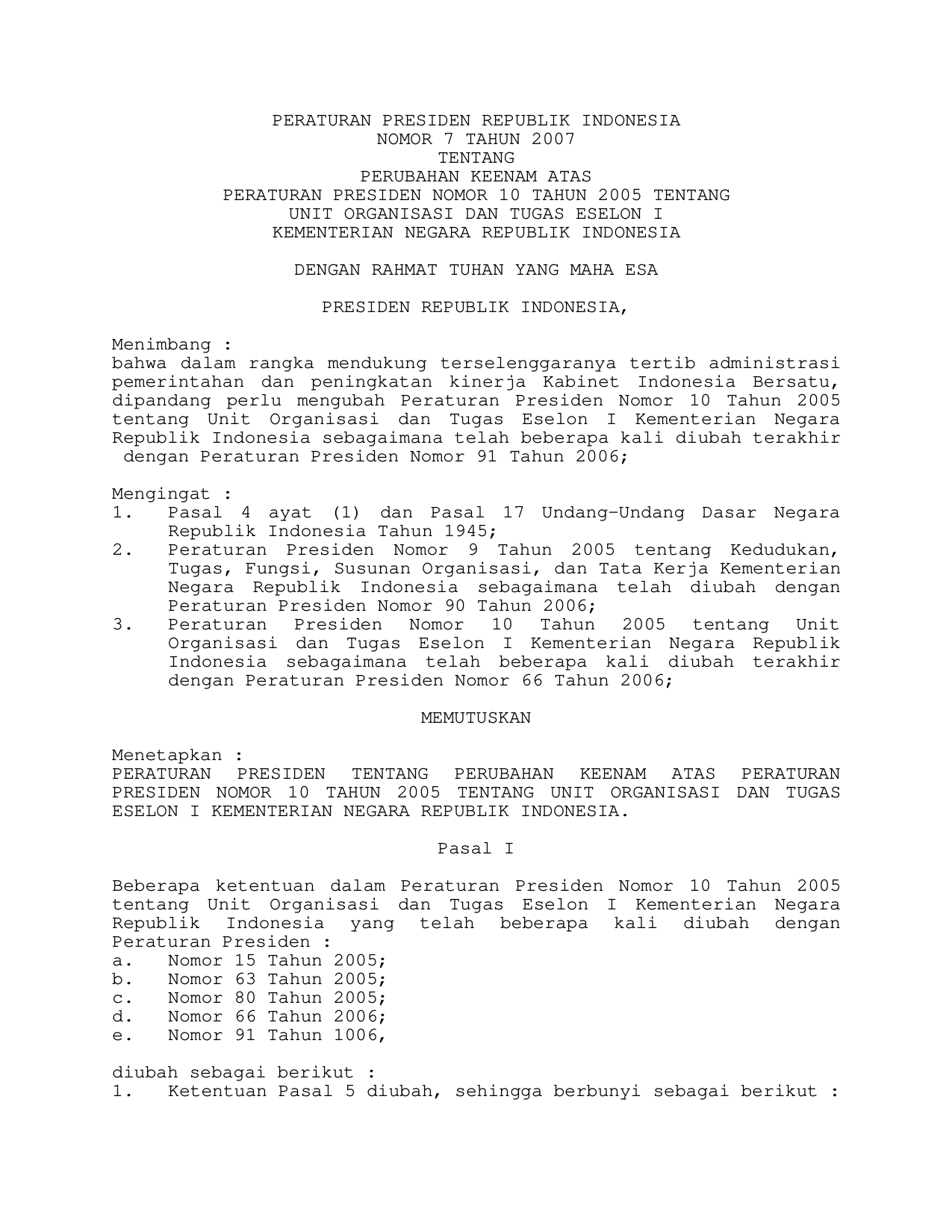 PERPRES Nomor 7 Tahun 2007 | Peraturan Presiden Nomor 7 Tahun 2007 tentang PERUBAHAN KEENAM PERPRES 10-2005 TENTANG UNIT ORGANISASI DAN TUGAS ESELON I KEMENTERIAN NEGARA RI