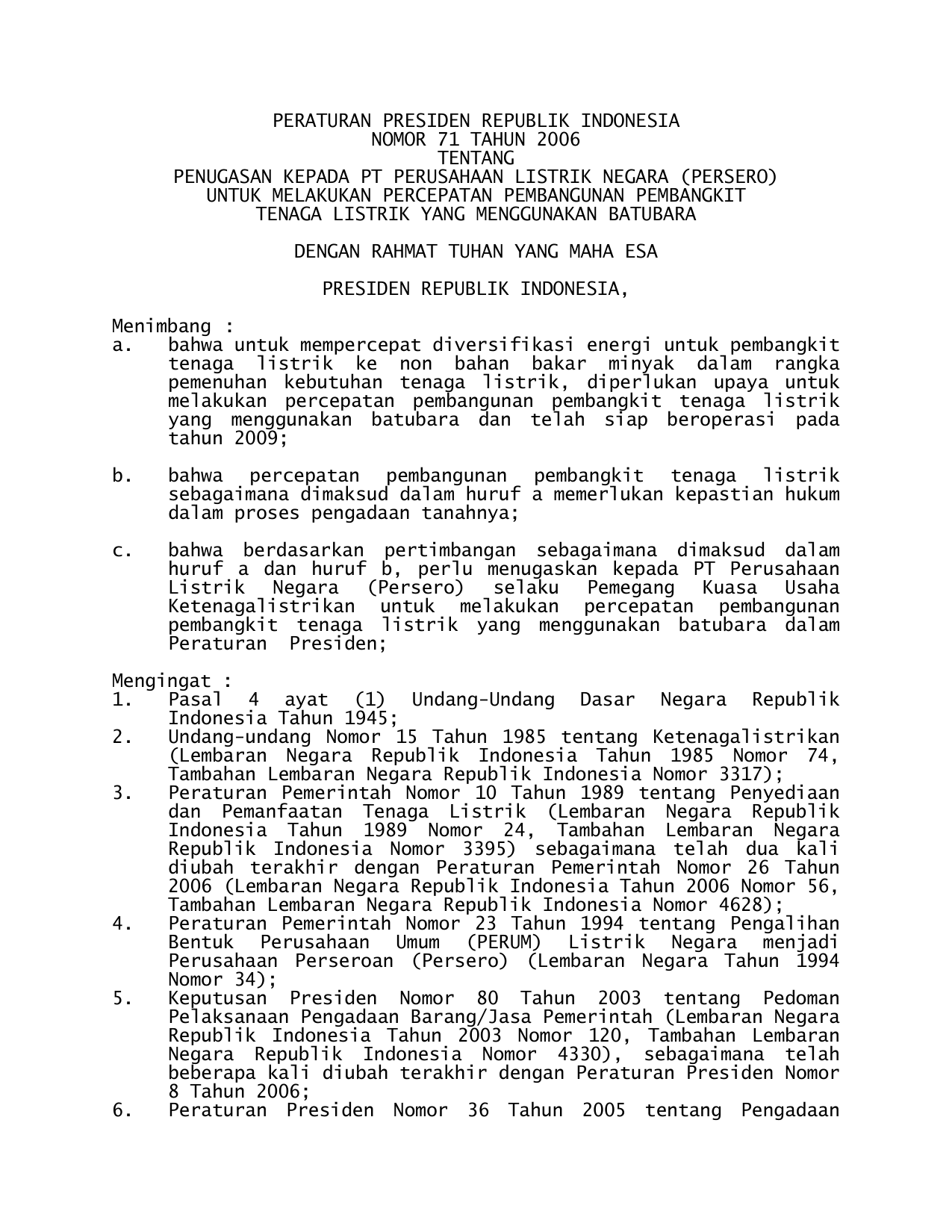 PERPRES Nomor 71 Tahun 2006 | Peraturan Presiden Nomor 71 Tahun 2006 tentang PENUGASAN KEPADA PT PERUSAHAAN LISTRIK NEGARA (PERSERO) UNTUK MELAKUKAN PERCEPATAN PEMBANGUNAN PEMBANGKIT TENAGA LISTRIK YANG MENGGUNAKAN BATUBARA
