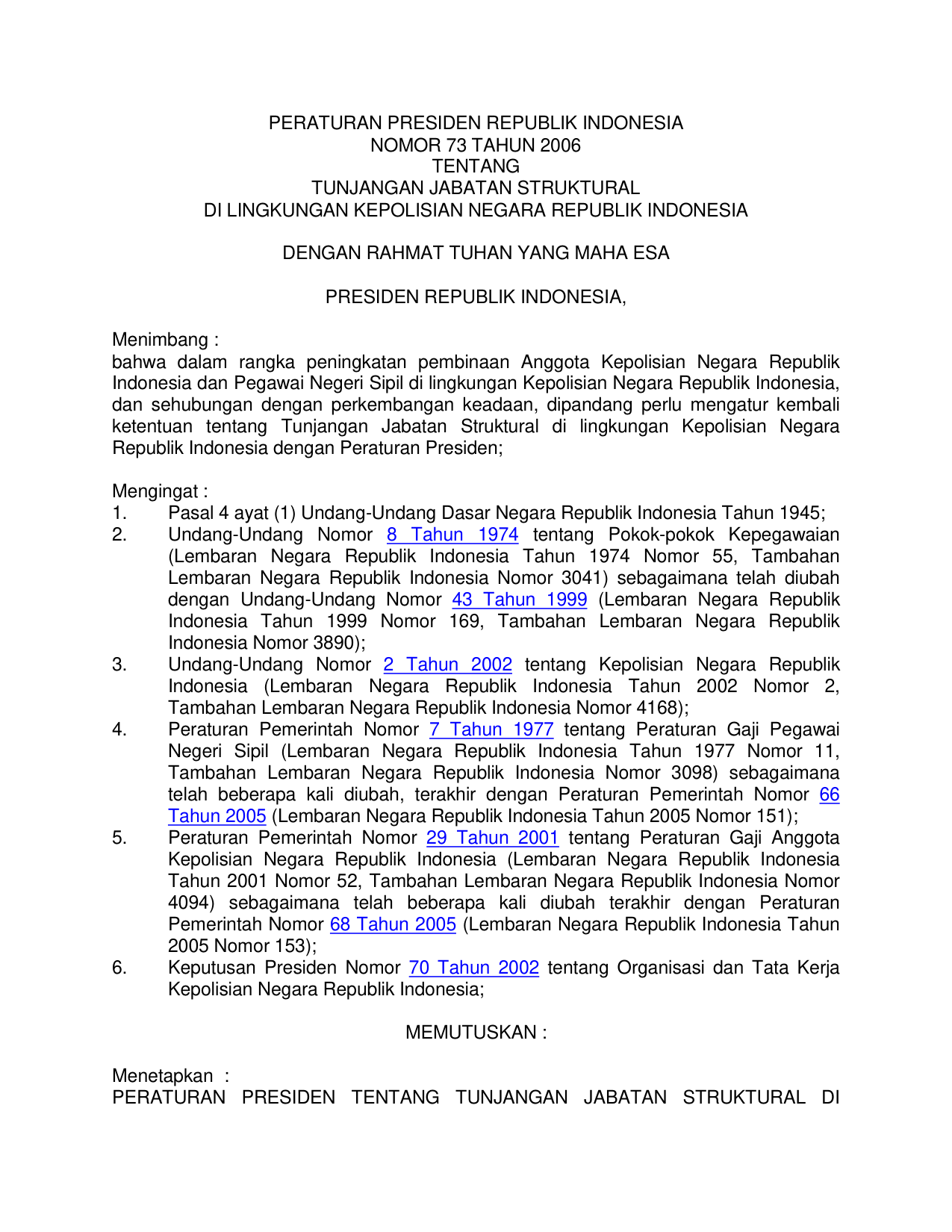 PERPRES Nomor 73 Tahun 2006 | Peraturan Presiden Nomor 73 Tahun 2006 tentang TUNJANGAN JABATAN STRUKTURAL DI LINGKUNGAN KEPOLISIAN NEGARA RI