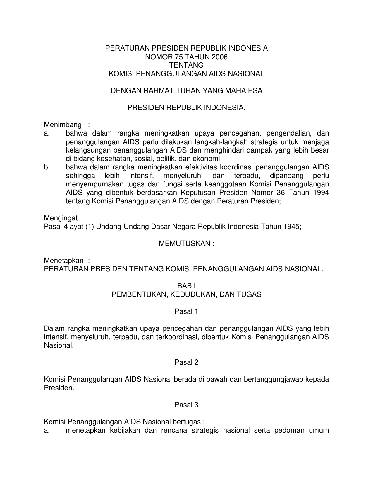 PERPRES Nomor 75 Tahun 2006 | Peraturan Presiden Nomor 75 Tahun 2006 tentang KOMISI PENANGGULANGAN AIDS NASIONAL
