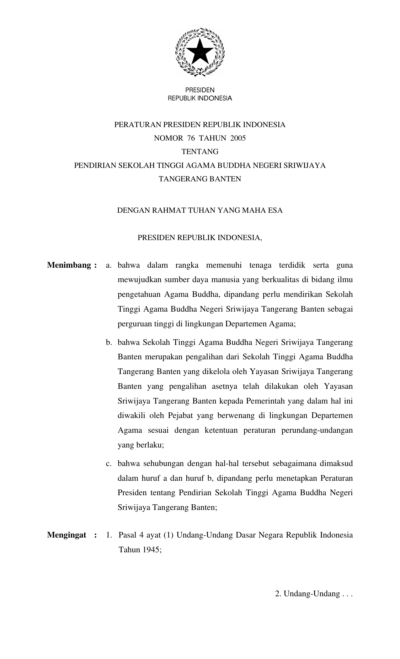PERPRES Nomor 76 Tahun 2005 | Peraturan Presiden Nomor 76 Tahun 2005 tentang PENDIRIAN SEKOLAH TINGGI AGAMA BUDDHA NEGERI SRIWIJAYA TANGERANG BANTEN