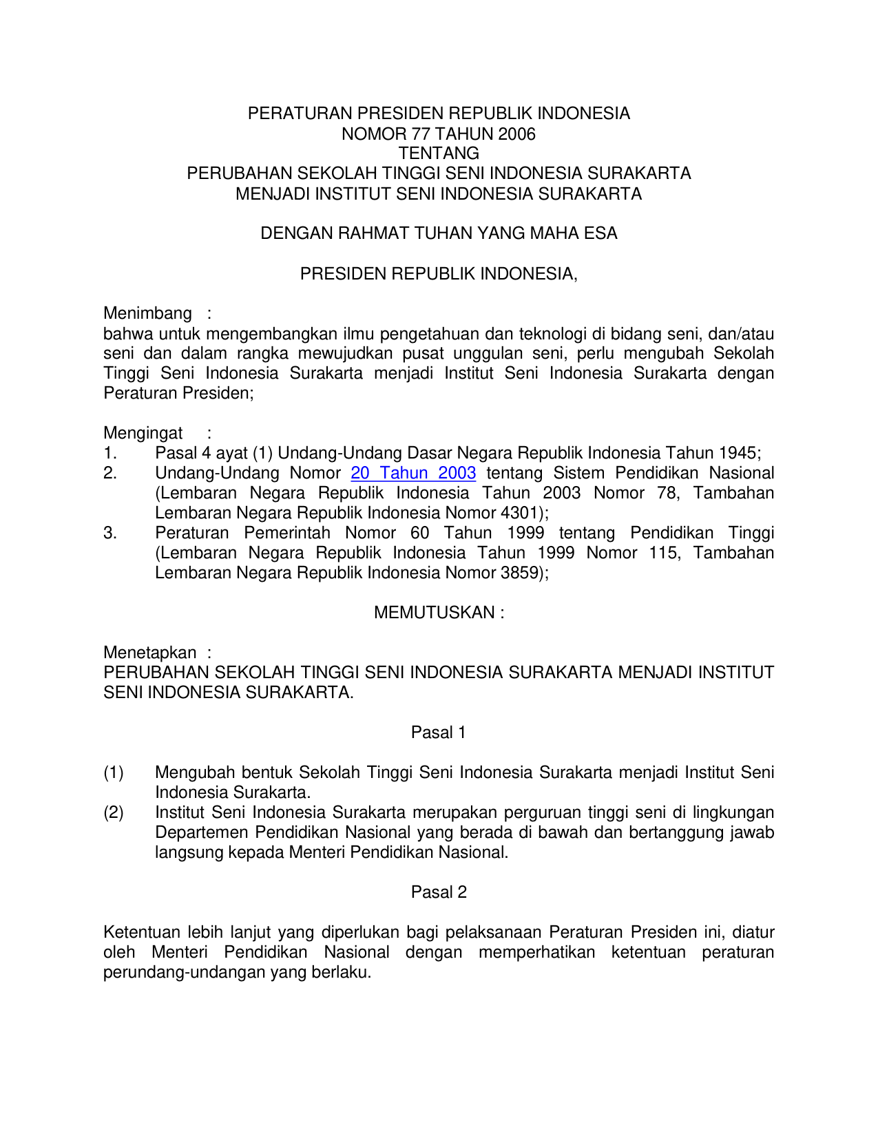 PERPRES Nomor 77 Tahun 2006 | Peraturan Presiden Nomor 77 Tahun 2006 tentang PERUBAHAN SEKOLAH TINGGI SENI INDONESIA SURAKARTA MENJADI INSTITUT SENI INDONESIA SURAKARTA