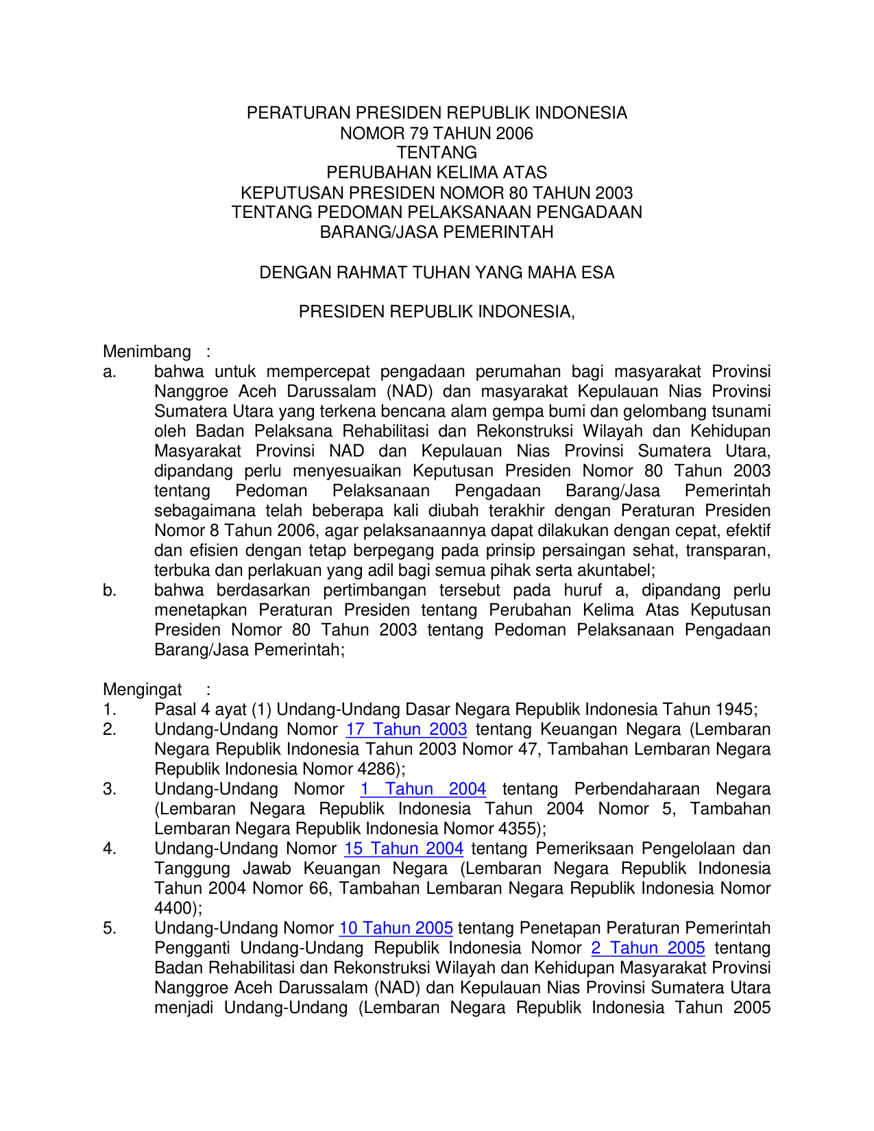 PERPRES Nomor 79 Tahun 2006 | Peraturan Presiden Nomor 79 Tahun 2006 tentang PERUBAHAN KELIMA KEPPRES 80-2003 TENTANG PEDOMAN PELAKSANAAN PENGADAAN BARANG/JASA PEMERINTAH