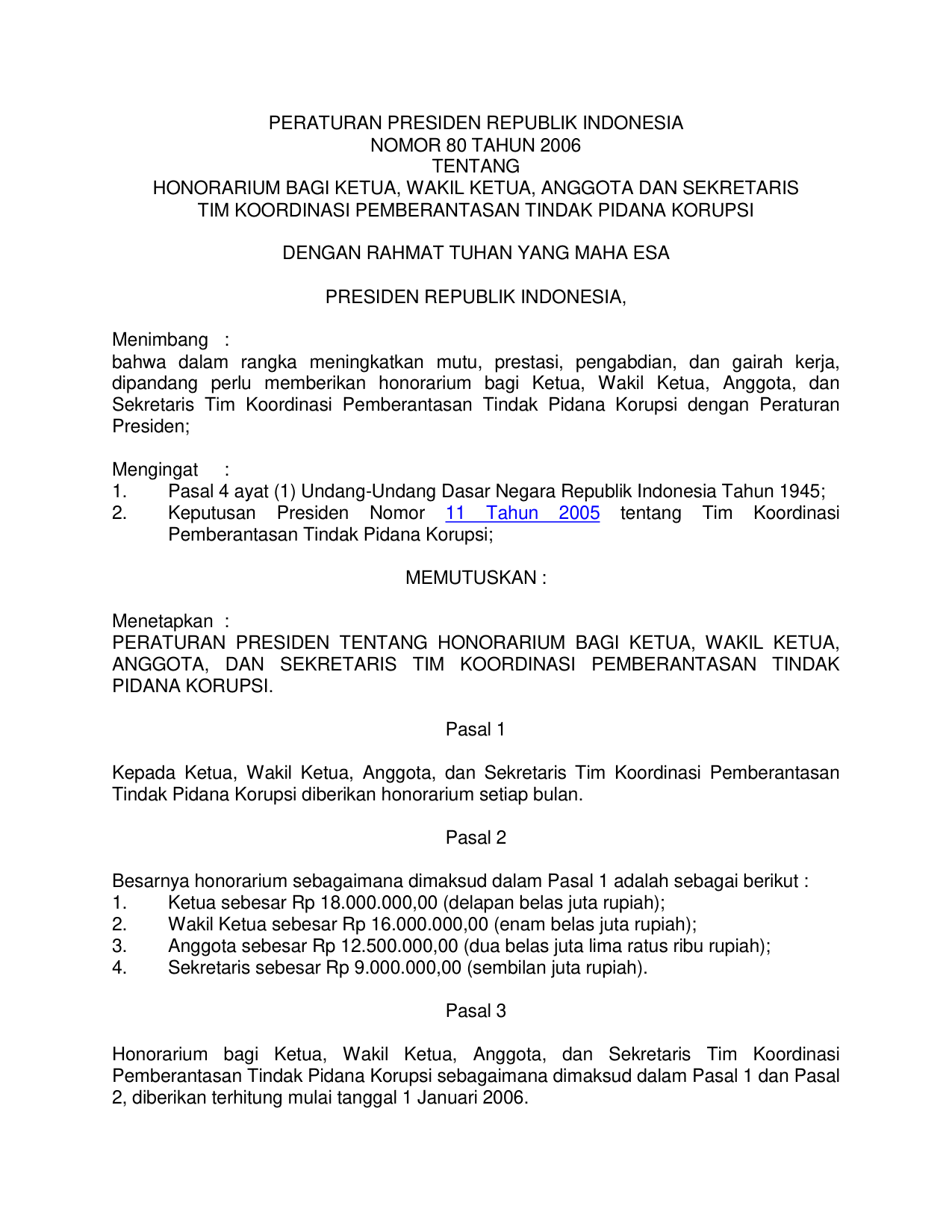 PERPRES Nomor 80 Tahun 2006 | Peraturan Presiden Nomor 80 Tahun 2006 tentang HONORARIUM BAGI KETUA, WAKIL KETUA, ANGGOTA, DAN SEKRETARIS TIM KOORDINASI PEMBERANTASAN TINDAK PIDANA KORUPSI