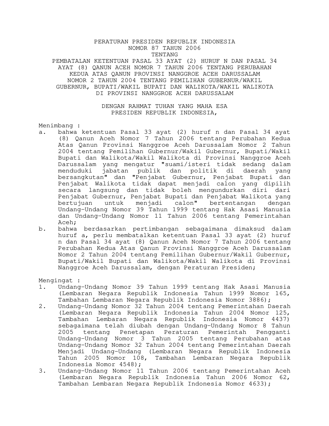 PERPRES Nomor 87 Tahun 2006 | Peraturan Presiden Nomor 87 Tahun 2006 tentang PEMBATALAN KETENTUAN PASAL 33 AYAT (2) HURUF N DAN PASAL 34 AYAT (8) QANUN ACEH NOMOR 7 TAHUN 2006 TENTANG PERUBAHAN KEDUA ATAS QANUN PROVINSI NANGGROE ACEH DARUSSALAM NOMOR 2 TAHUN 2004 TENTANG PEMILIHAN GUBERNUR/WAKIL GUBERNUR BUPATI/WAKIL BUPATI DAN WALIKOTA/WAKIL WALIKOTA DI PROVINSI NANGGROE ACEH DARUSSALAM
