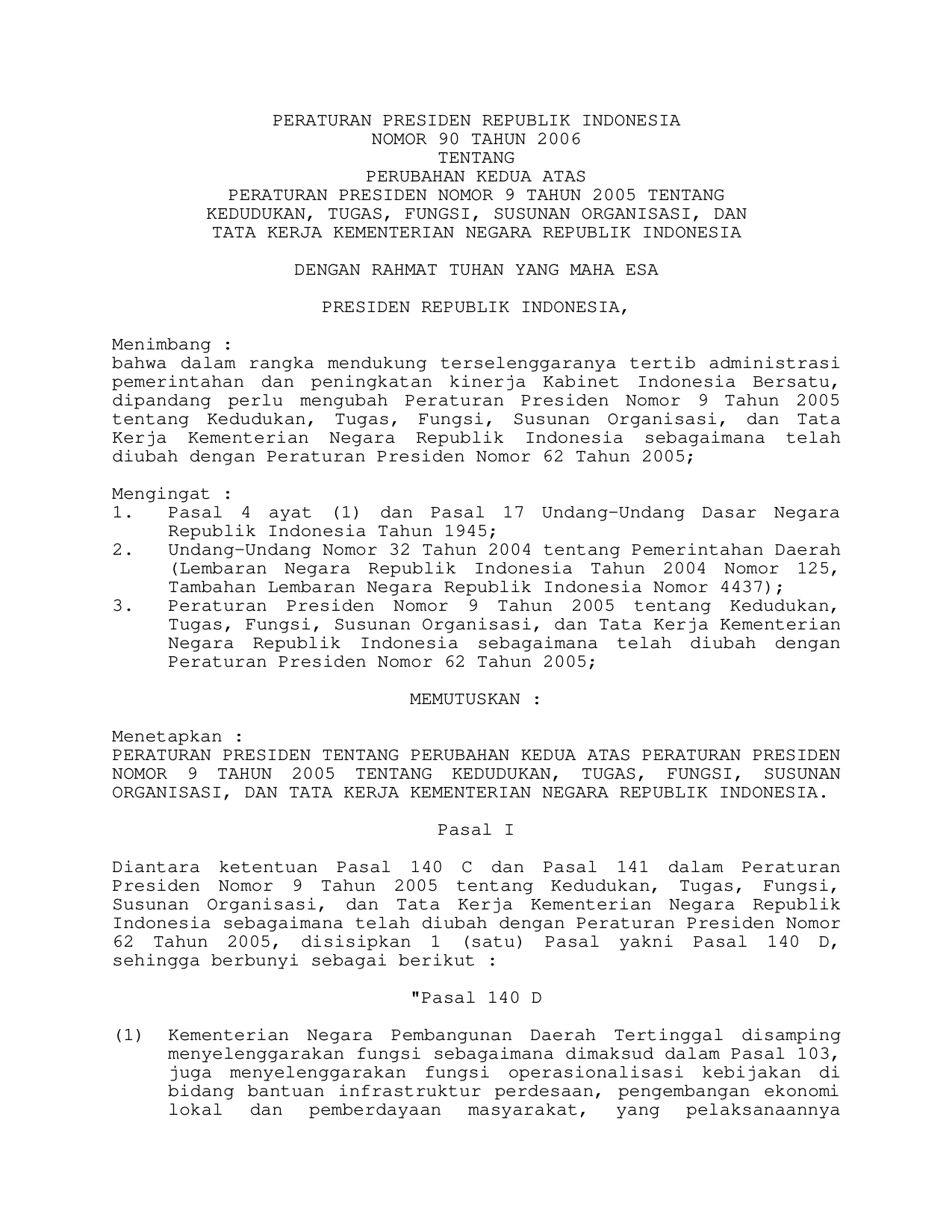 PERPRES Nomor 90 Tahun 2006 | Peraturan Presiden Nomor 90 Tahun 2006 tentang PERUBAHAN KEDUA PERPRES 9-2005 TENTANG KEDUDUKAN TUGAS FUNGSI SUSUNAN ORGANISASI DAN TATA KERJA KEMENTERIAN NEGARA RI