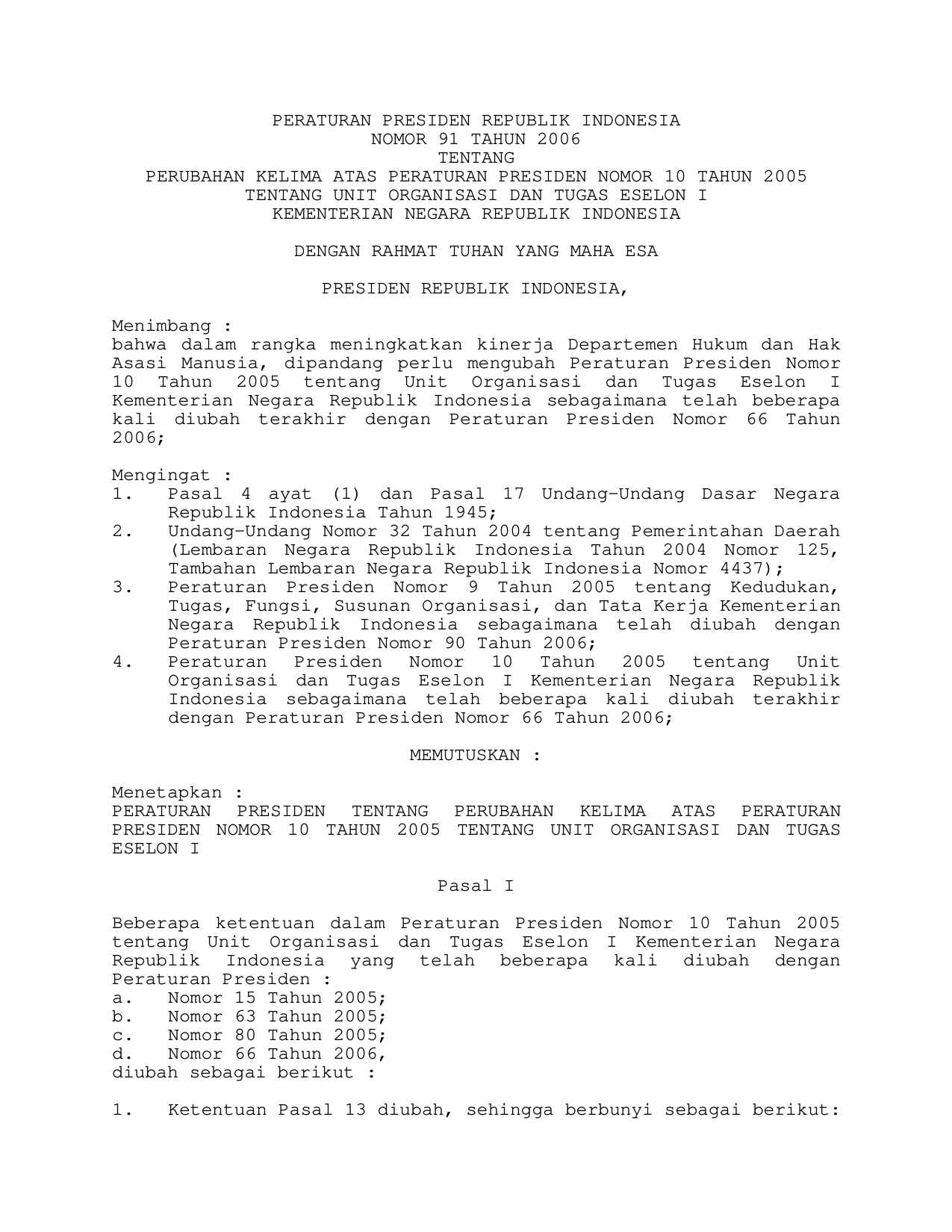 PERPRES Nomor 91 Tahun 2006 | Peraturan Presiden Nomor 91 Tahun 2006 tentang PERUBAHAN KELIMA PERPRES 10-2005 TENTANG UNIT ORGANISASI DAN TUGAS ESELON I KEMENTERIAN NEGARA RI