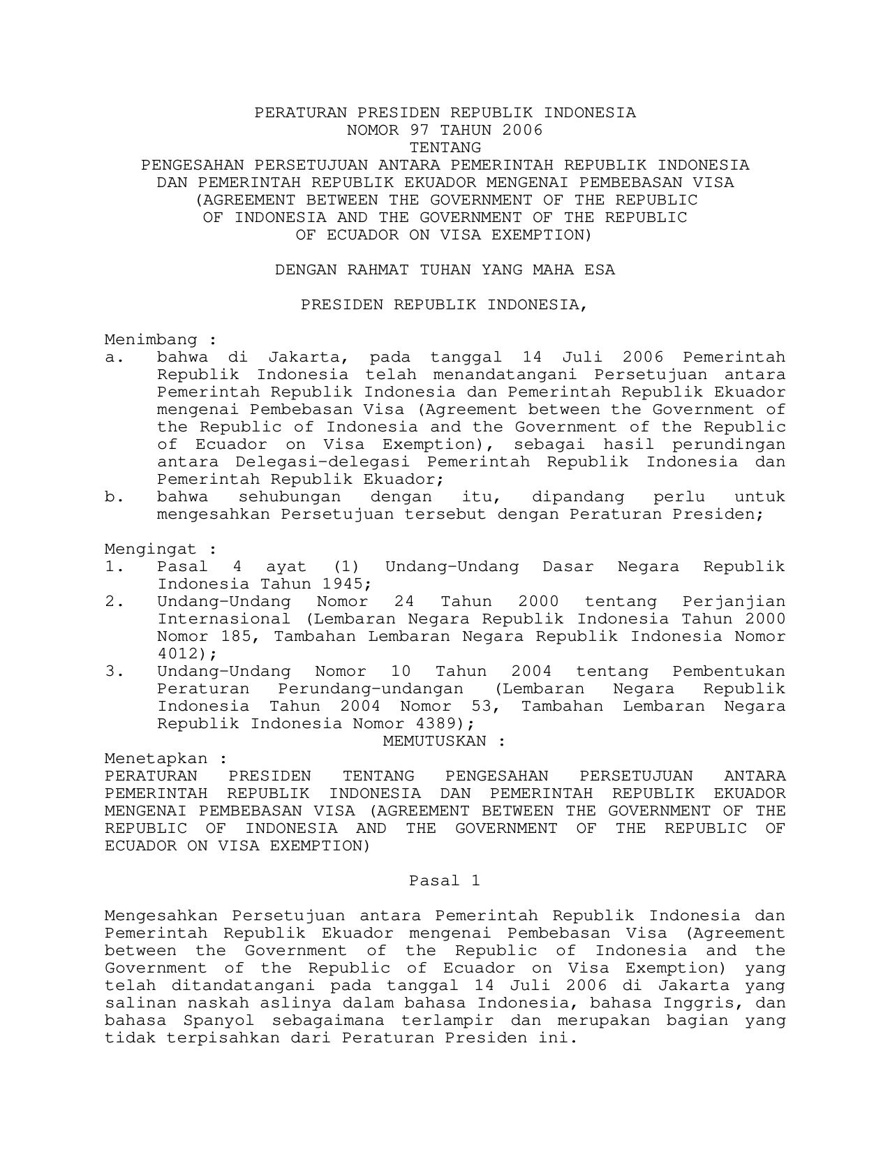 PERPRES Nomor 97 Tahun 2006 | Peraturan Presiden Nomor 97 Tahun 2006 tentang PENGESAHAN PERSETUJUAN ANTARA PEMERINTAH RI DAN PEMERINTAH REPUBLIK EKUADOR MENGENAI PEMBEBASAN VISA (AGREEMENT BETWEEN THE GOVERNMENT OF THE REPUBLIC OF INDONESIA AND THE GOVERNMENT OF THE REPUBLIC OF ECUADOR ON VISA EXEMPTION)
