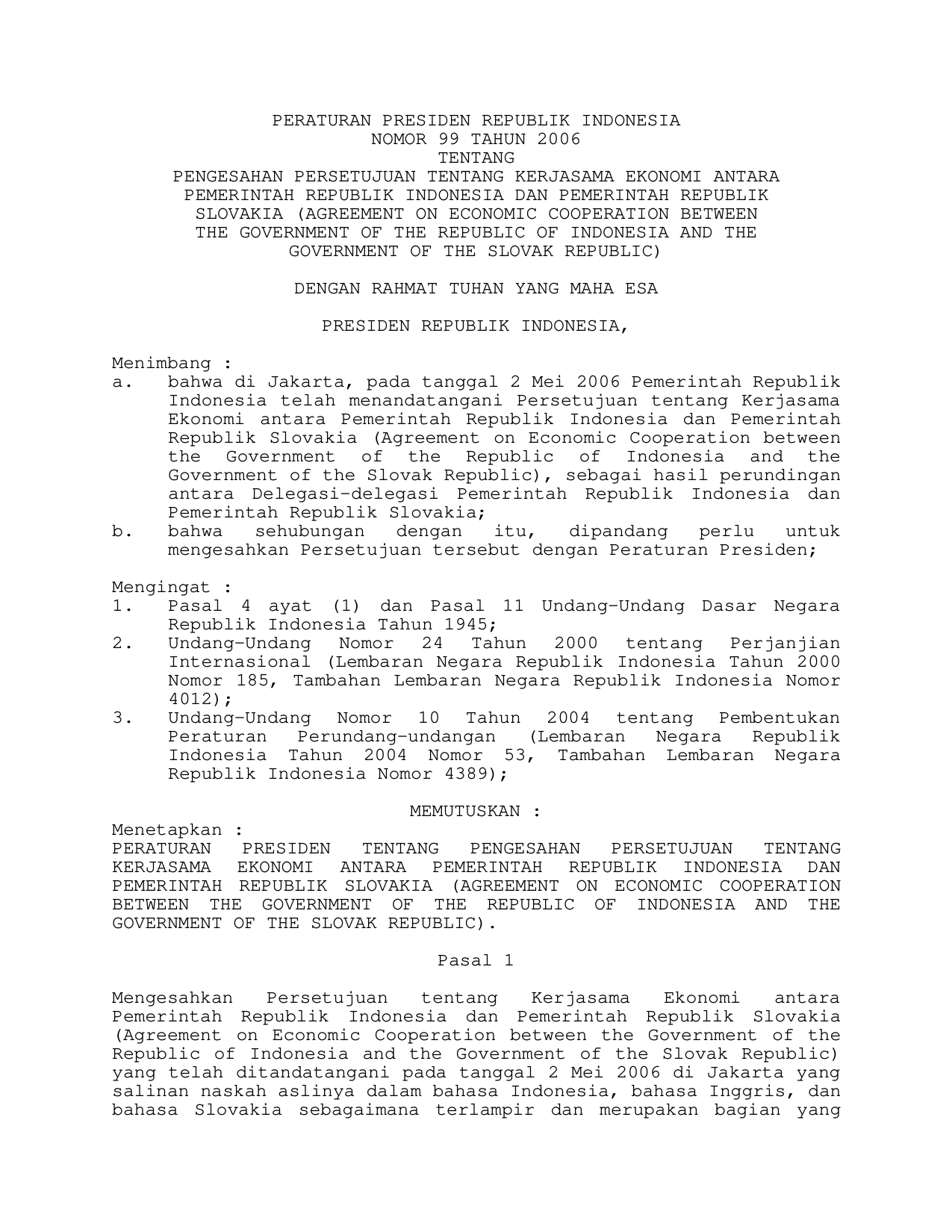 PERPRES Nomor 99 Tahun 2006 | Peraturan Presiden Nomor 99 Tahun 2006 tentang PENGESAHAN PERSETUJUAN TENTANG KERJA SAMA EKONOMI ANTARA PEMERINTAH RI DAN PEMERINTAH REPUBLIK SLOVAKIA (AGREEMENT ON ECONOMIC COOPERATION BETWEEN THE GOVERNMENT OF THE REPUBLIC OF INDONESIA AND THE GOVERNMENT OF THE SLOVAK REPUBLIC)
