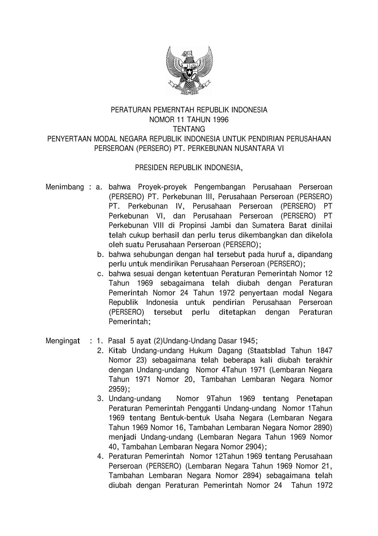 PP Nomor 11 Tahun 1996 | Peraturan Pemerintah Nomor 11 Tahun 1996 tentang PENYERTAAN MODAL NEGARA RI UNTUK PENDIRIAN PERUSAHAAN PERSEROAN (PERSERO) PT PERKEBUNAN NUSANTARA VI