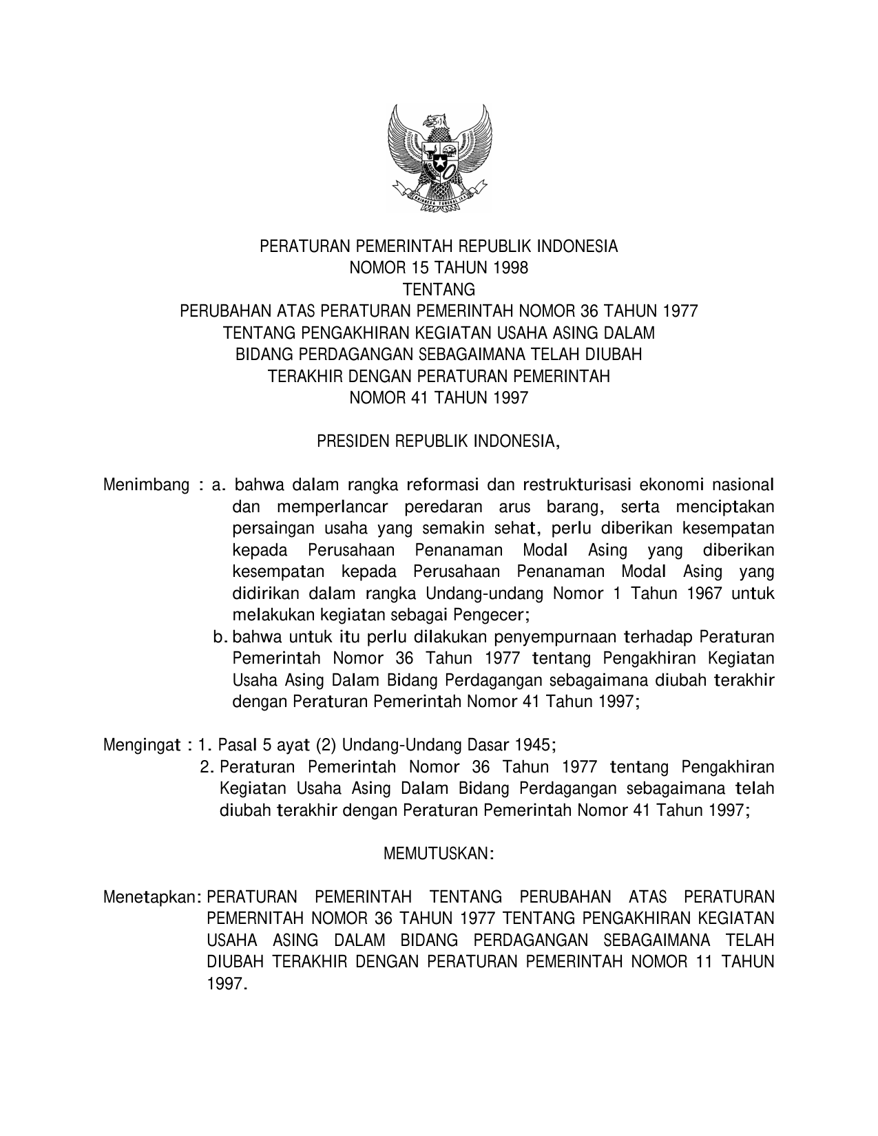 PP Nomor 15 Tahun 1998 | Peraturan Pemerintah Nomor 15 Tahun 1998 tentang PERUBAHAN PP 36-1977 TENTANG PENGAKHIRAN KEGIATAN USAHA ASING DALAM BIDANG PERDAGANGAN SEBAGAIMANA TELAH DIUBAH TERAKHIR DENGAN PP 41-1997