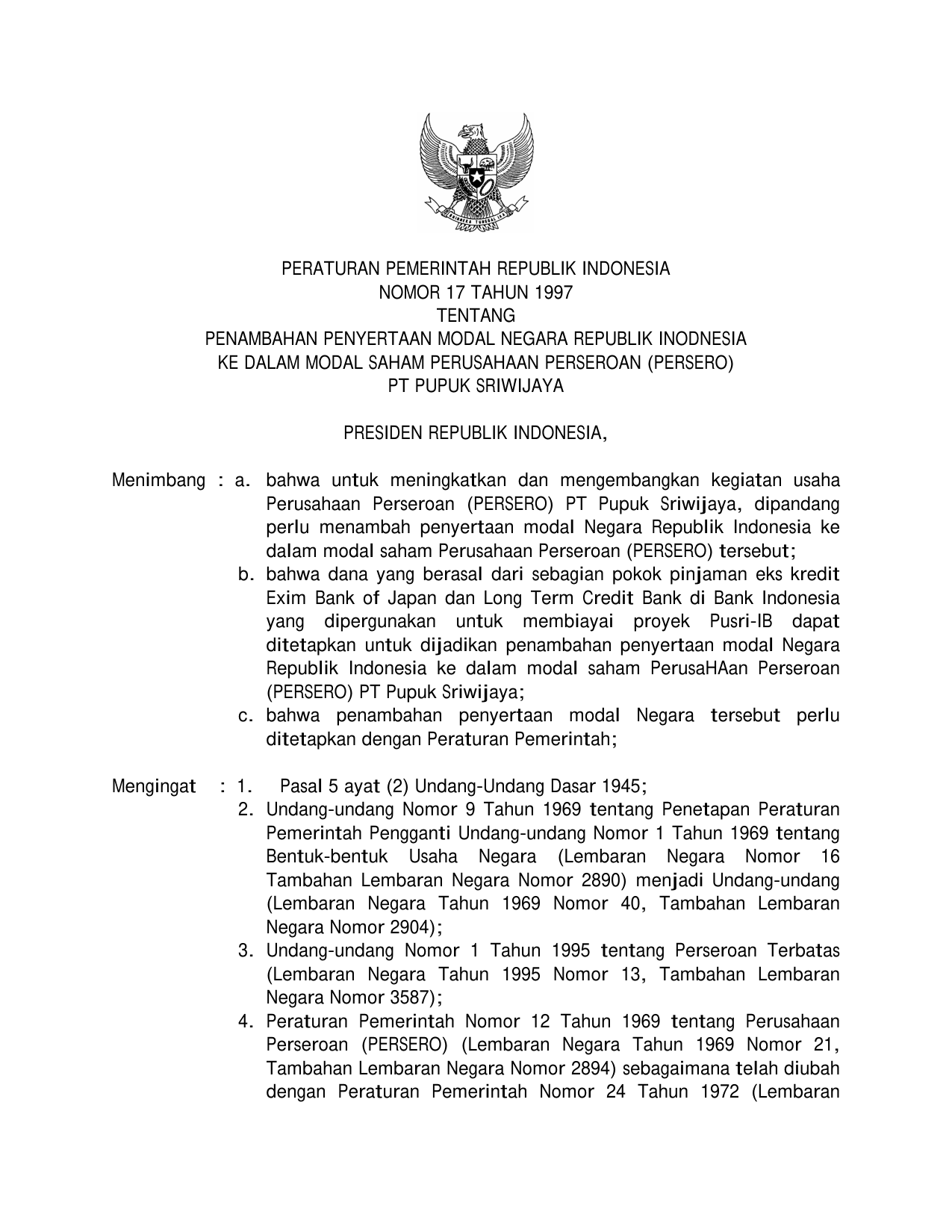 PP Nomor 17 Tahun 1997 | Peraturan Pemerintah Nomor 17 Tahun 1997 tentang PENAMBAHAN PENYERTAAN MODAL NEGARA RI KE DALAM SAHAM PERUSAHAAN PERSEROAN (PERSERO) P.T. PUPUK SRIWIJAYA