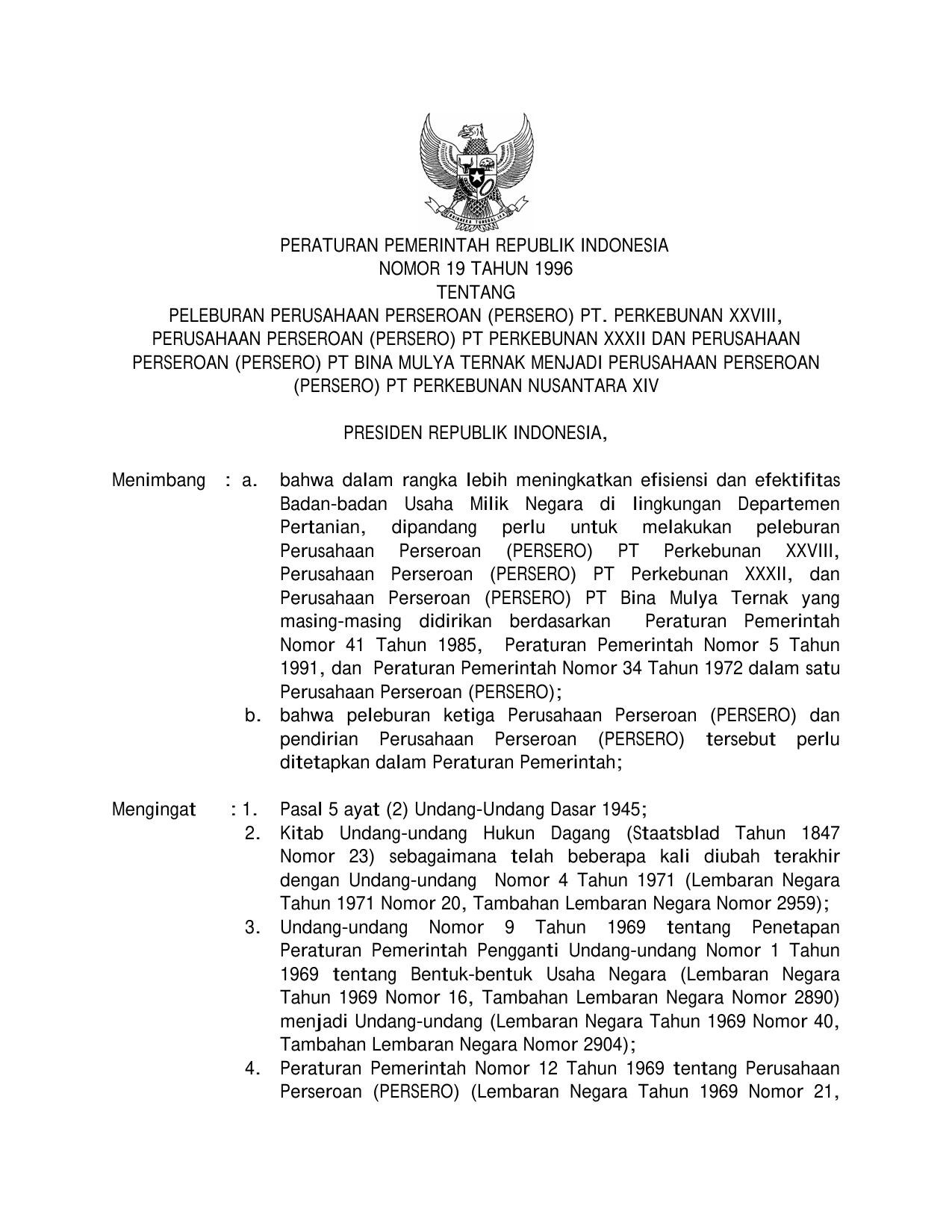PP Nomor 19 Tahun 1996 | Peraturan Pemerintah Nomor 19 Tahun 1996 tentang PELEBURAN PERUSAHAAN PERSEROAN (PERSERO) PT PERKEBUNAN XXVIII, PERUSAHAAN PERSEROAN (PERSERO) PT PERKEBUNAN XXXII DAN PERUSAHAAN PERSEROAN (PERSERO) PT BINA MULYA TERNAK MENJADI PERUSAHAAN PERSEROAN (PERSERO) PT PERKEBUNAN NUSANTARA XIV