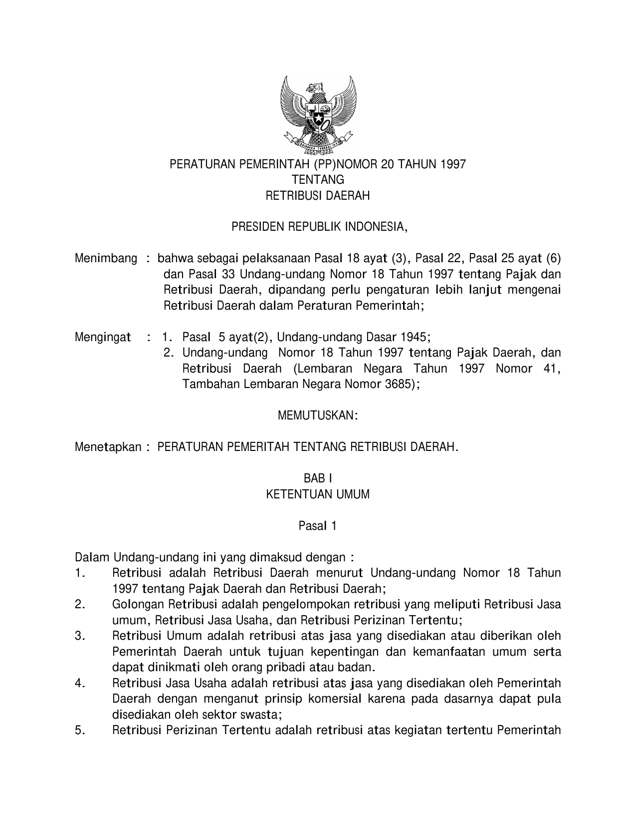 PP Nomor 20 Tahun 1997 | Peraturan Pemerintah Nomor 20 Tahun 1997 tentang RETRIBUSI DAERAH