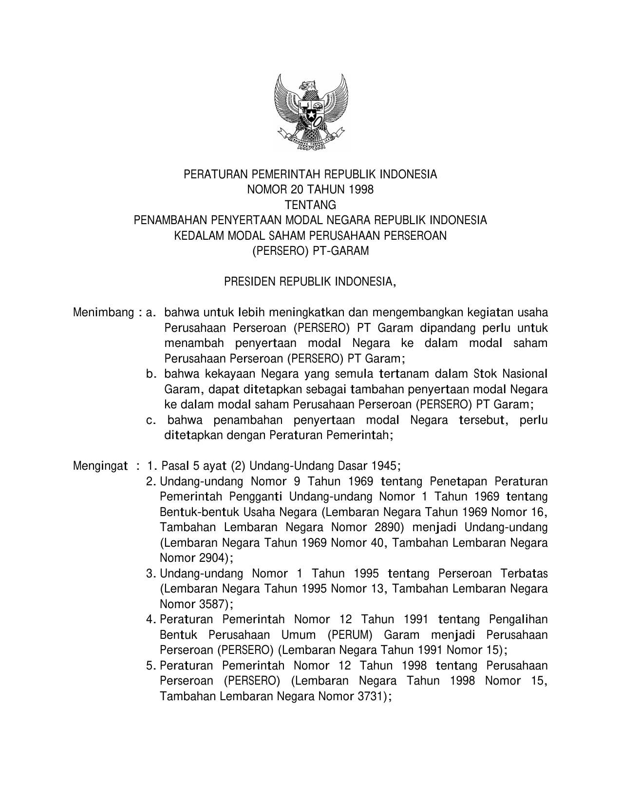 PP Nomor 20 Tahun 1998 | Peraturan Pemerintah Nomor 20 Tahun 1998 tentang PENAMBAHAN PENYERTAAN MODAL NEGARA RI KE DALAM MODAL SAHAM PERUSAHAAN PERSEROAN (PERSERO) PT GARAM