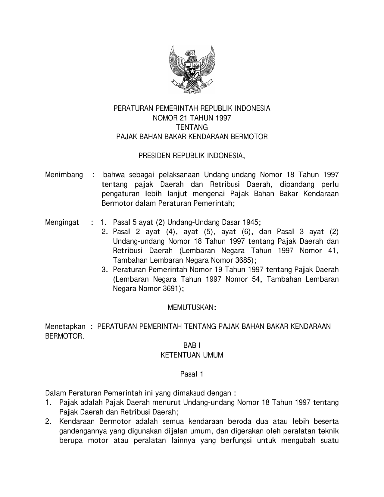 PP Nomor 21 Tahun 1997 | Peraturan Pemerintah Nomor 21 Tahun 1997 tentang PAJAK BAHAN BAKAR KENDARAAN BERMOTOR