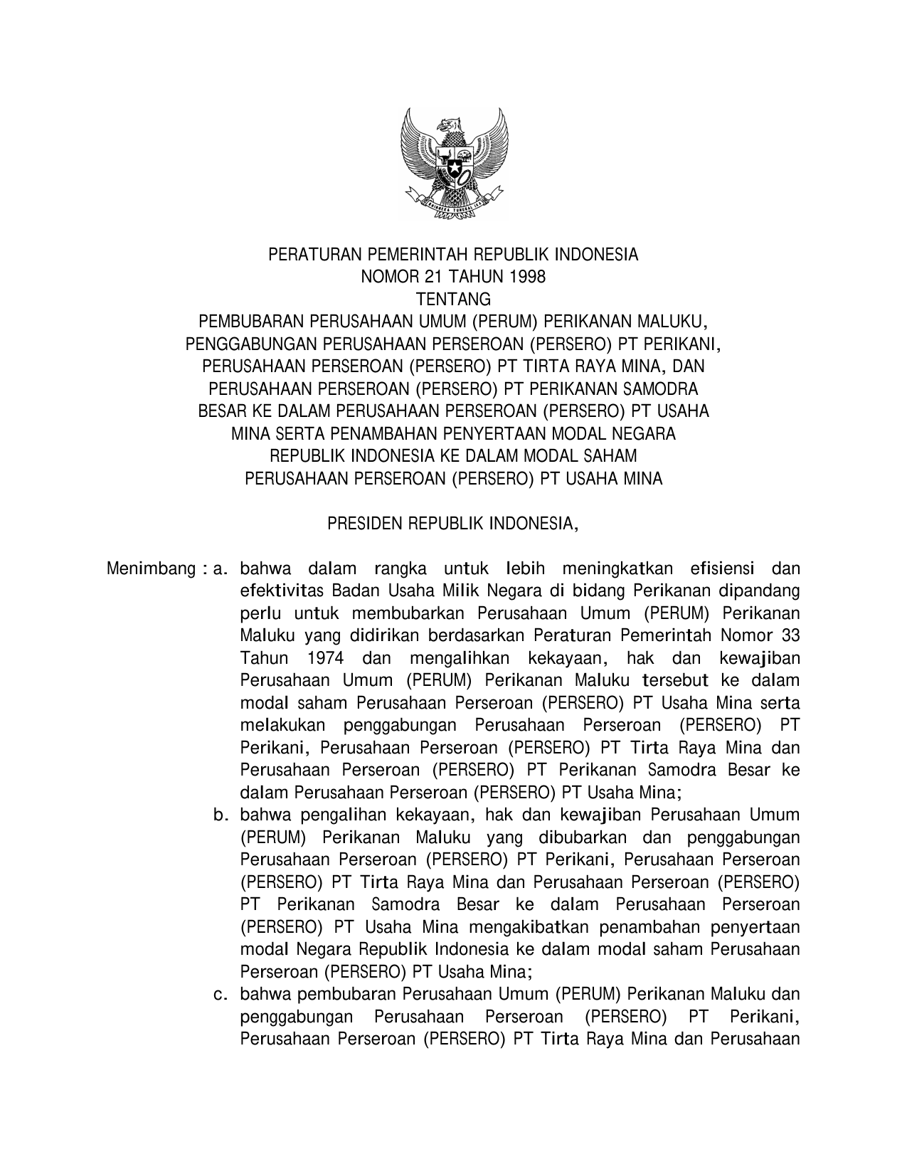 PP Nomor 21 Tahun 1998 | Peraturan Pemerintah Nomor 21 Tahun 1998 tentang PEMBUBARAN PERUSAHAAN UMUM (PERUM) PERIKANAN MALUKU, PENGGABUNGAN PERUSAHAAN PERSEROAN (PERSERO) PT PERIKANI, PERUSAHAAN PERSEROAN (PERSERO) PT TIRTA RAYA MINA, DAN PERUSAHAAN PERSEROAN (PERSERO) PT PERIKANAN SAMUDERA BESAR KE DALAM PERUSAHAAN PERSEROAN (PERSERO) PT USAHA MINAS SERTA PENAMBAHAN PENYERTAAN MODAL NEGARA RI KE DALAM MODAL SAHAM PERUSAHAAN PERSEROAN (PERSERO) PT USAHA MINA