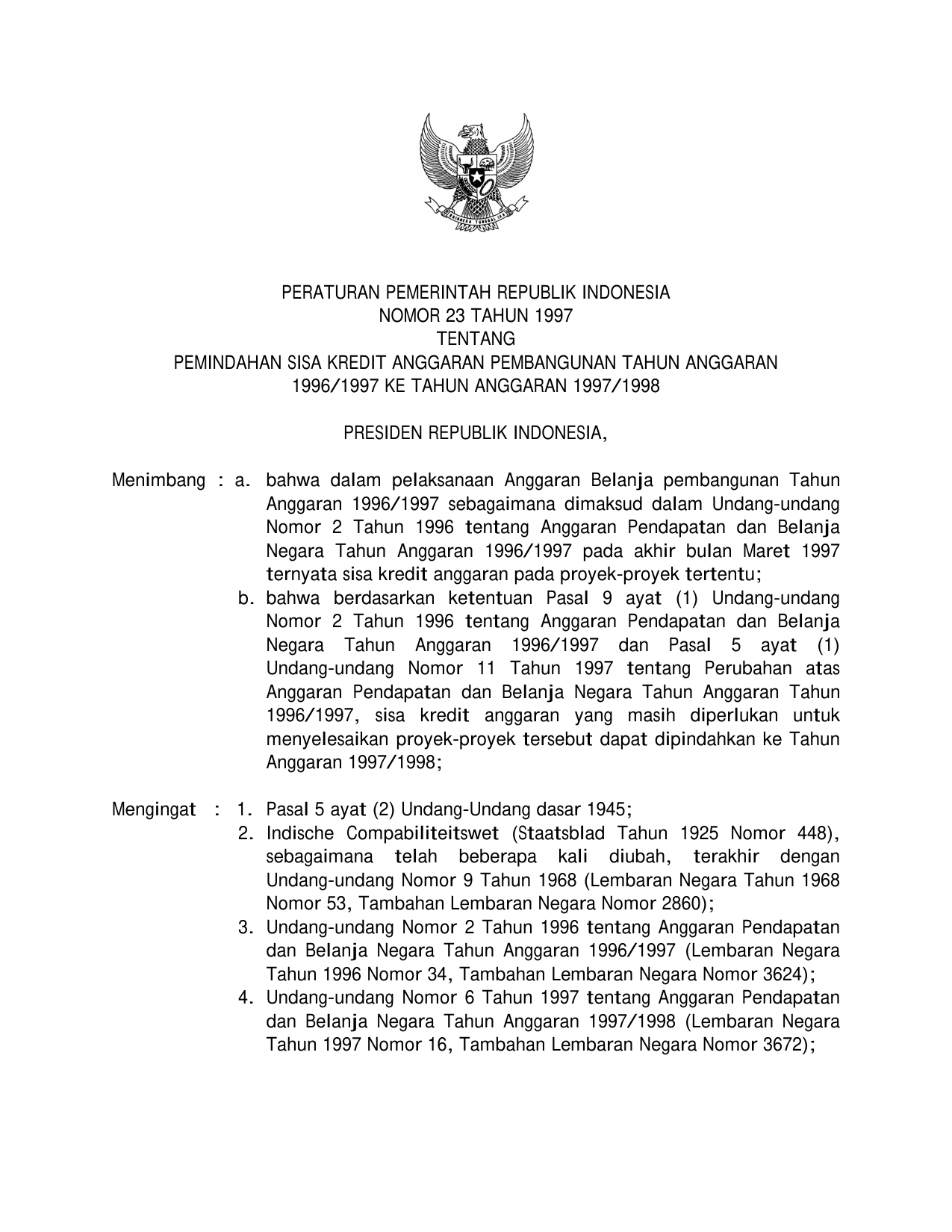 PP Nomor 23 Tahun 1997 | Peraturan Pemerintah Nomor 23 Tahun 1997 tentang PEMINDAHAN SISA KREDIT ANGGARAN PEMBANGUNAN TAHUN ANGGARAN 1996/1997 KE TAHUN ANGGARAN 1997/1998