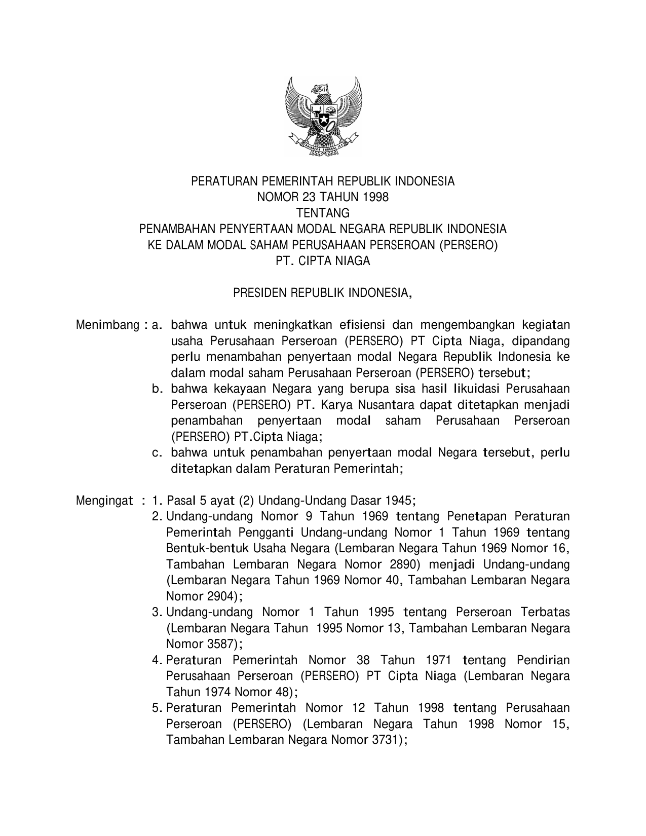 PP Nomor 23 Tahun 1998 | Peraturan Pemerintah Nomor 23 Tahun 1998 tentang PENAMBAHAN PENYERTAAN MODAL NEGARA RI KE DALAM MODAL SAHAM PERUSAHAAN PERSEROAN (PERSERO) PT CIPTA NIAGA