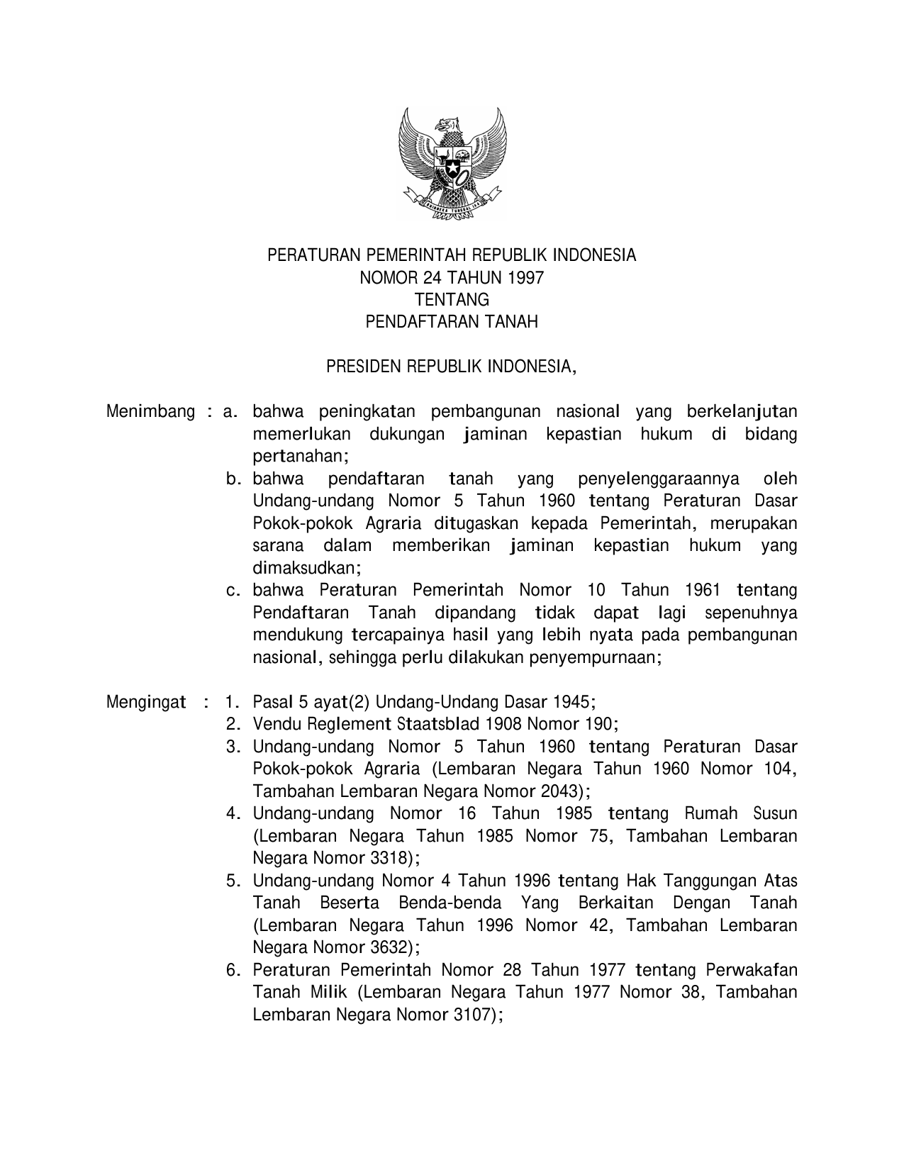 PP Nomor 24 Tahun 1997 | Peraturan Pemerintah Nomor 24 Tahun 1997 tentang PENDAFTARAN TANAH