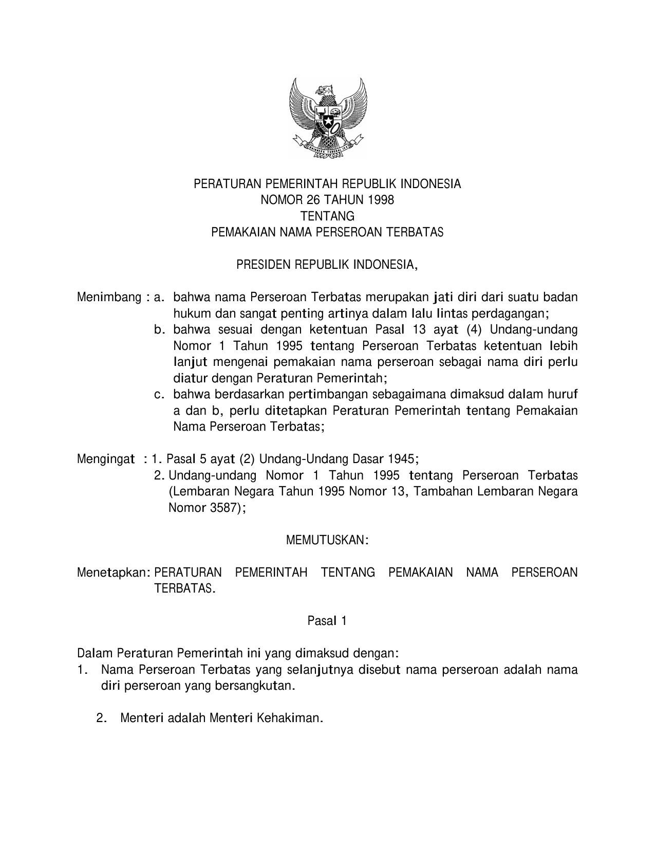 PP Nomor 26 Tahun 1998 | Peraturan Pemerintah Nomor 26 Tahun 1998 tentang PEMAKAIAN NAMA PERSEROAN TERBATAS