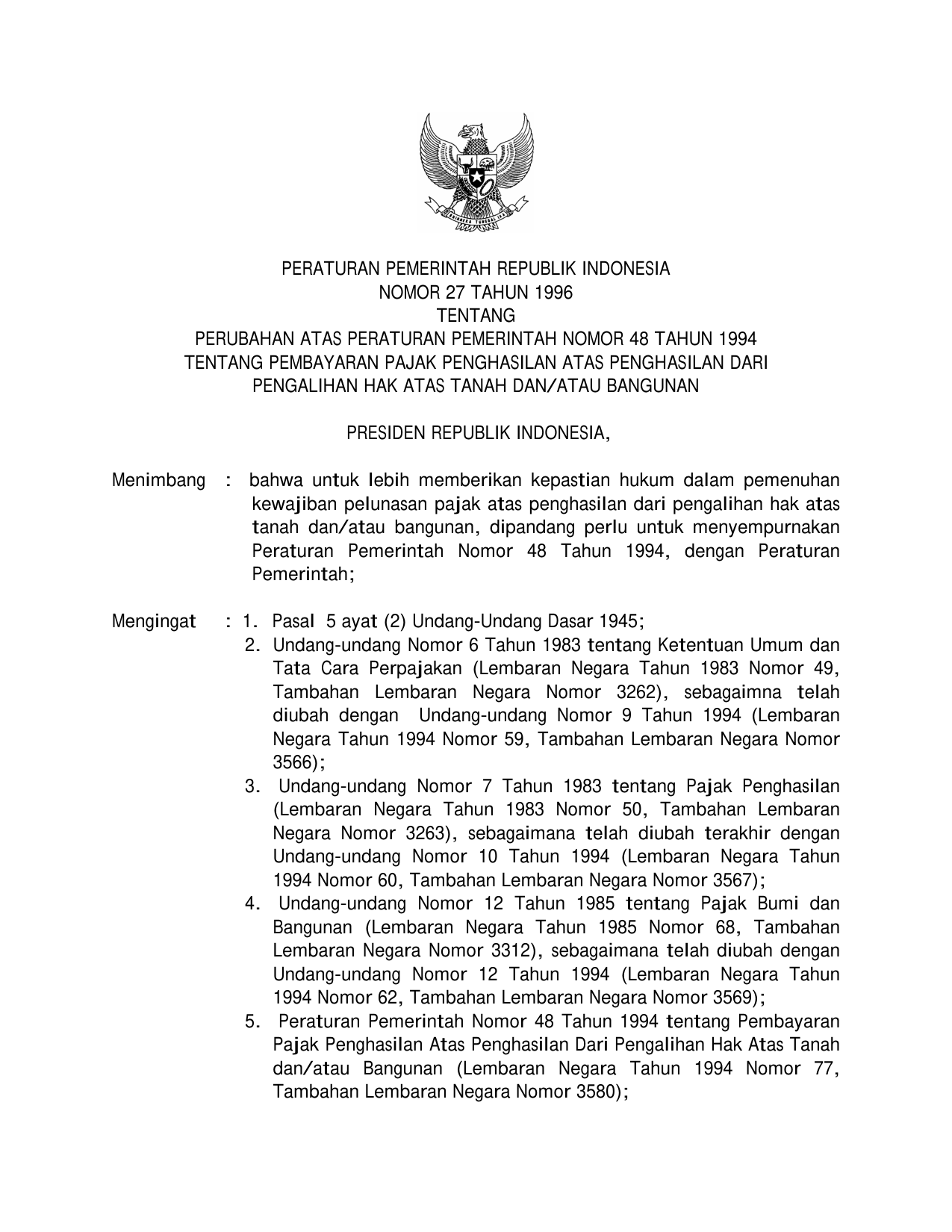 PP Nomor 27 Tahun 1996 | Peraturan Pemerintah Nomor 27 Tahun 1996 tentang PERUBAHAN PP 48-1994 TENTANG PEMBAYARAN PAJAK PENGHASILAN ATAS PENGHASILAN DARI PENGALIHAN HAK ATAS TANAH DAN/ATAU BANGUNAN
