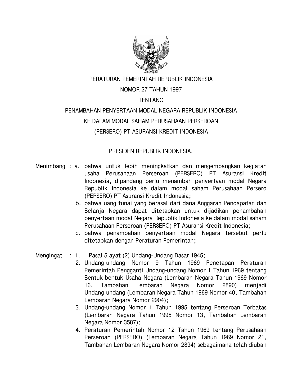 PP Nomor 27 Tahun 1997 | Peraturan Pemerintah Nomor 27 Tahun 1997 tentang PENAMBAHAN PENYERTAAN MODAL NEGARA RI KE DALAM MODAL SAHAM PERUSAHAAN PERSEROAN (PERSERO) P.T. ASURANSI KREDIT INDONESIA