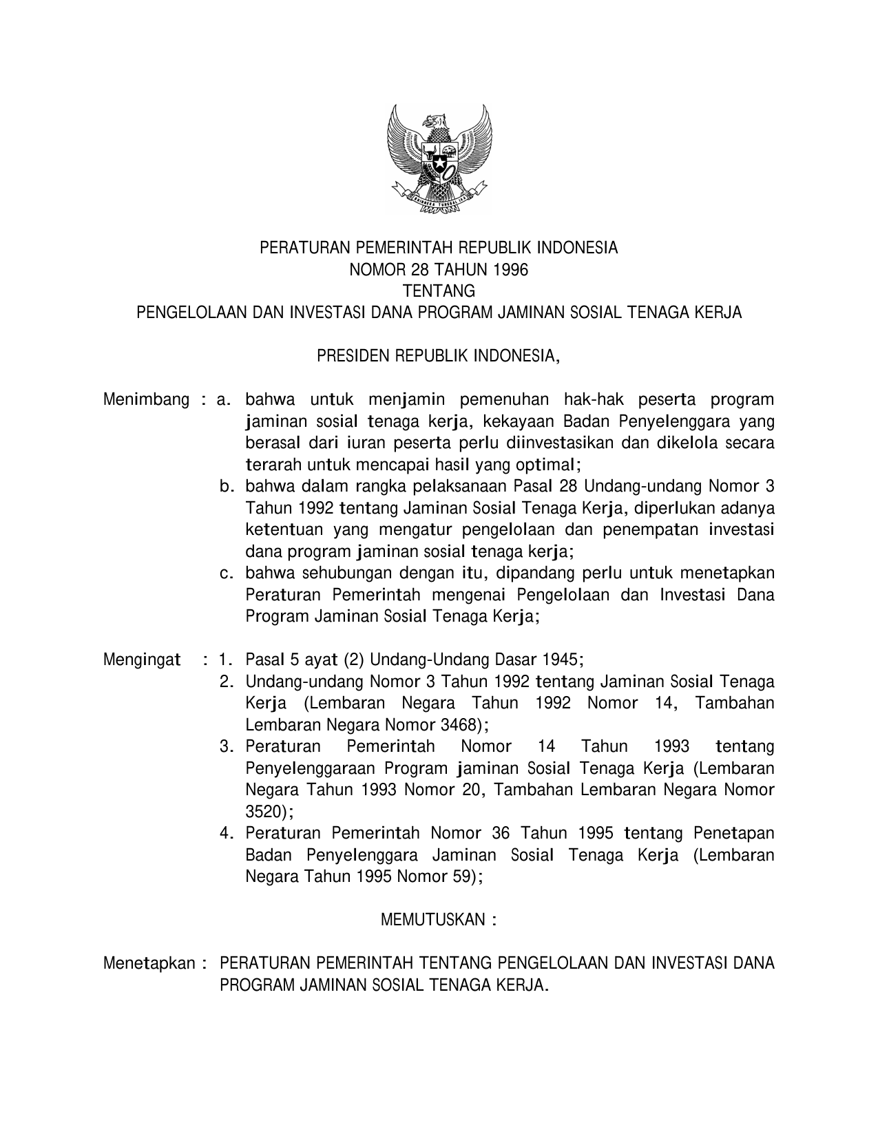 PP Nomor 28 Tahun 1996 | Peraturan Pemerintah Nomor 28 Tahun 1996 tentang PENGELOLAAN DAN INVESTASI DANA PROGRAM JAMINAN SOSIAL TENAGA KERJA