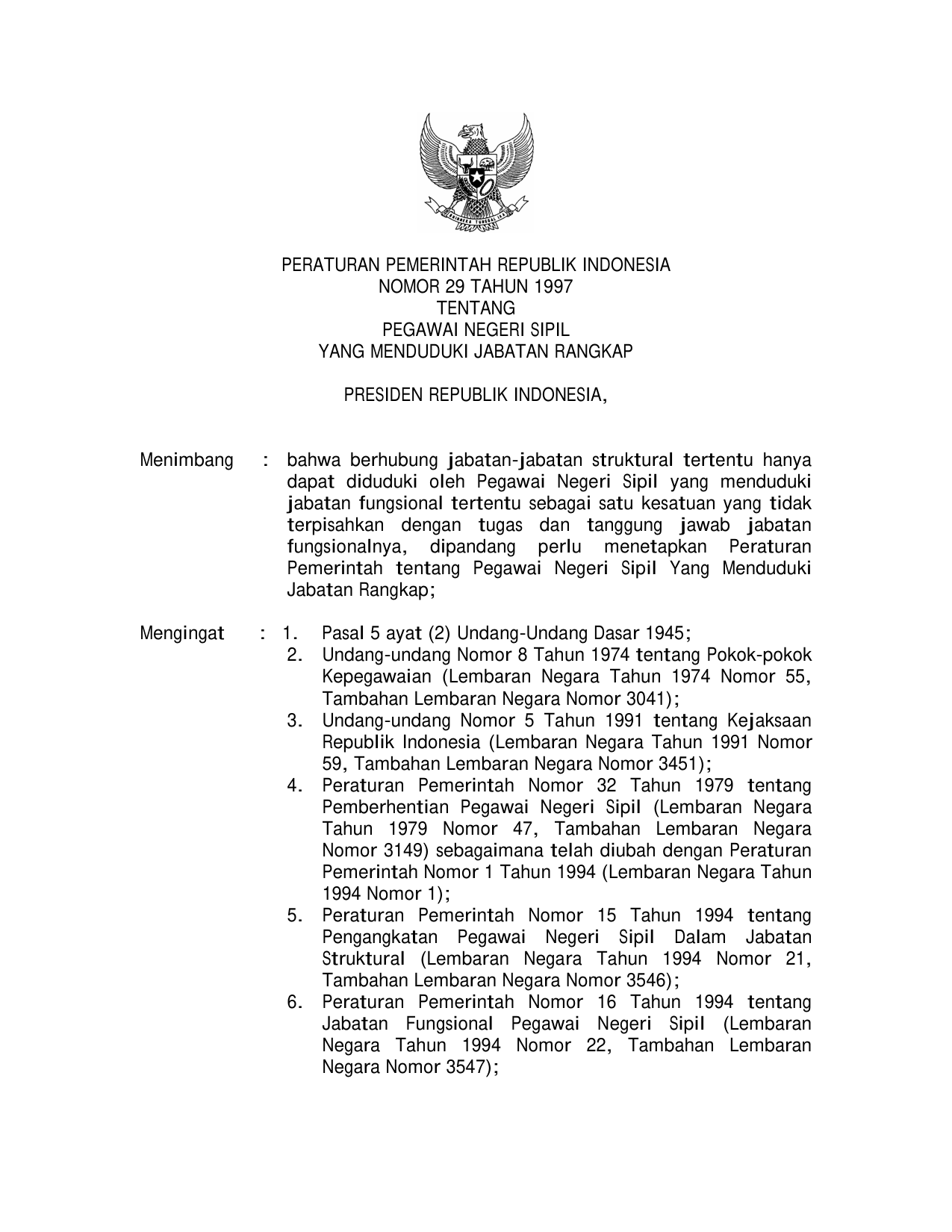 PP Nomor 29 Tahun 1997 | Peraturan Pemerintah Nomor 29 Tahun 1997 tentang PEGAWAI NEGERI SIPIL YANG MENDUDUKI JABATAN RANGKAP