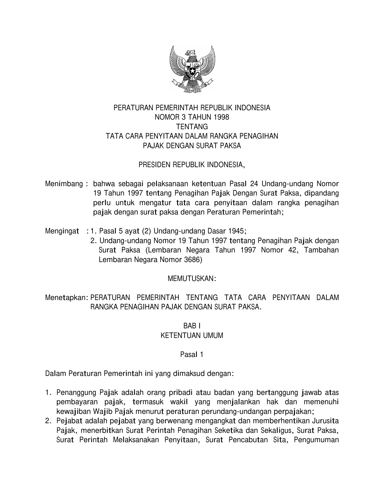 PP Nomor 3 Tahun 1998 | Peraturan Pemerintah Nomor 3 Tahun 1998 tentang TATA CARA PENYITAAN DALAM RANGKA PENAGIHAN PAJAK DENGAN SURAT PAKSA