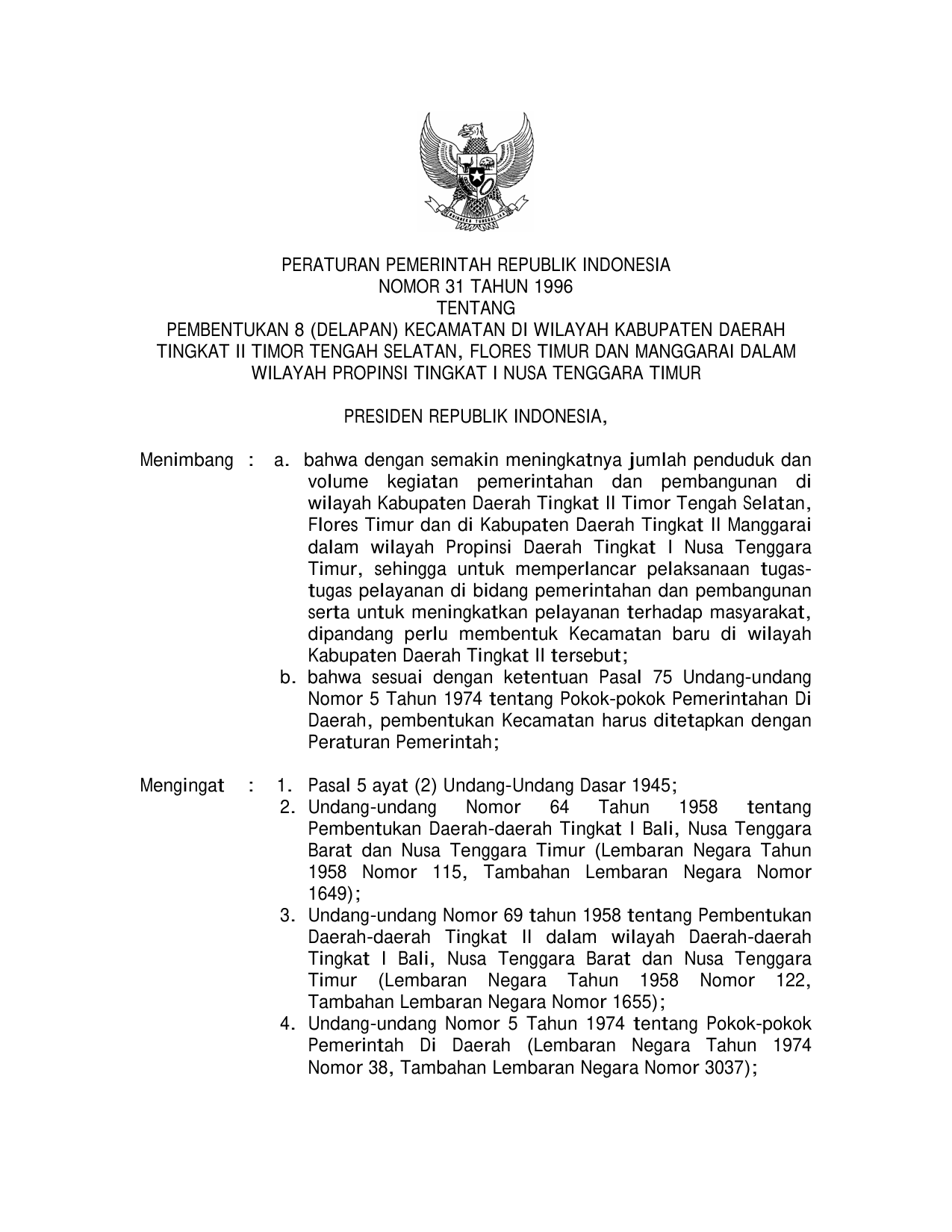 PP Nomor 30 Tahun 1996 | Peraturan Pemerintah Nomor 30 Tahun 1996 tentang PEMBENTUKAN 8 (DELAPAN) KECAMATAN DI WILAYAH KABUPATEN FLORES TIMUR DAN MANGGARAI DALAM WILAYAH PROPINSI DATI I NUSA TENGGARA TIMUR