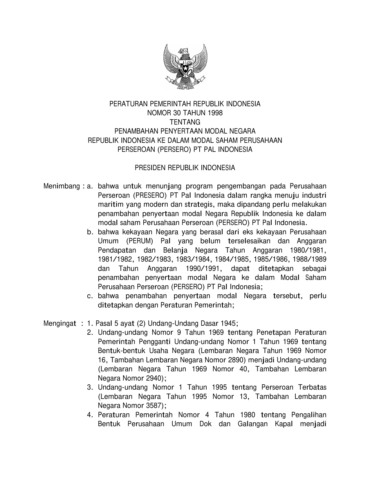 PP Nomor 30 Tahun 1998 | Peraturan Pemerintah Nomor 30 Tahun 1998 tentang PENAMBAHAN PENYERTAAN MODAL NEGARA RI KE DALAM MODAL SAHAM PERUSAHAAN PERSEROAN (PERSERO) PT PAL INDONESIA