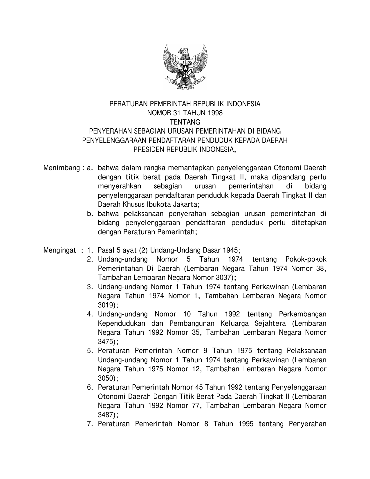 PP Nomor 31 Tahun 1998 | Peraturan Pemerintah Nomor 31 Tahun 1998 tentang PENYERAHAN SEBAGIAN URUSAN PEMERINTAH DI BIDANG PENYELENGGARAAN PENDAFTARAN PENDUDUK KEPADA DAERAH