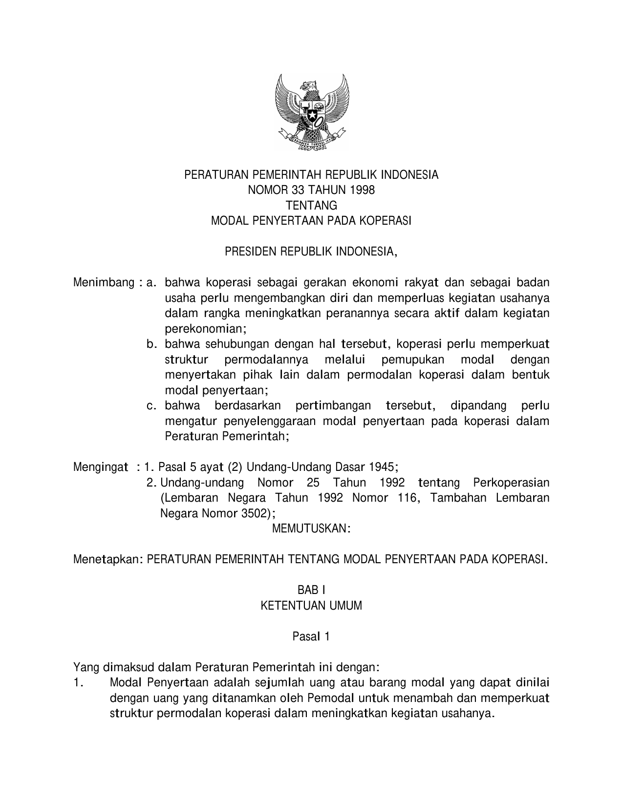 PP Nomor 33 Tahun 1998 | Peraturan Pemerintah Nomor 33 Tahun 1998 tentang MODAL PENYERTAAN PADA KOPERASI