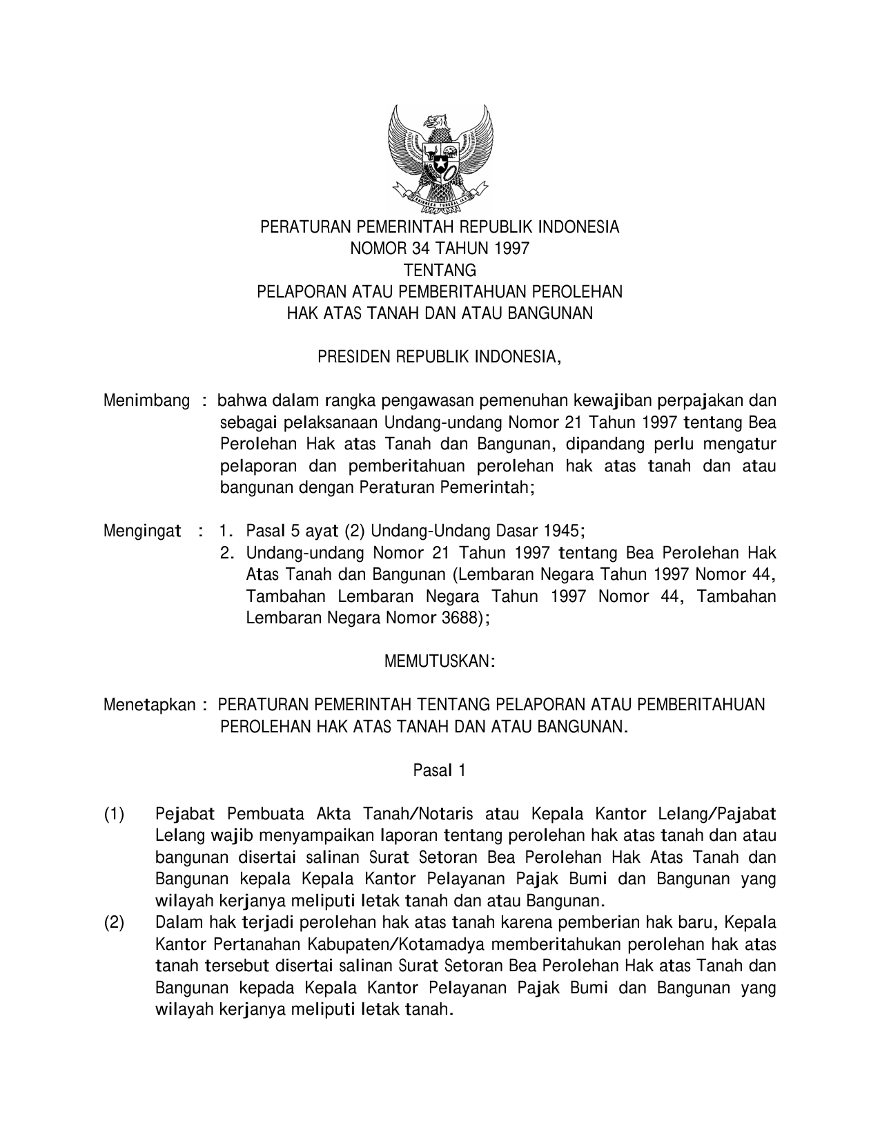 PP Nomor 34 Tahun 1997 | Peraturan Pemerintah Nomor 34 Tahun 1997 tentang LAPORAN ATAU PEMBERITAHUAN PEROLEHAN HAK ATAS TANAH DAN ATAU BANGUNAN