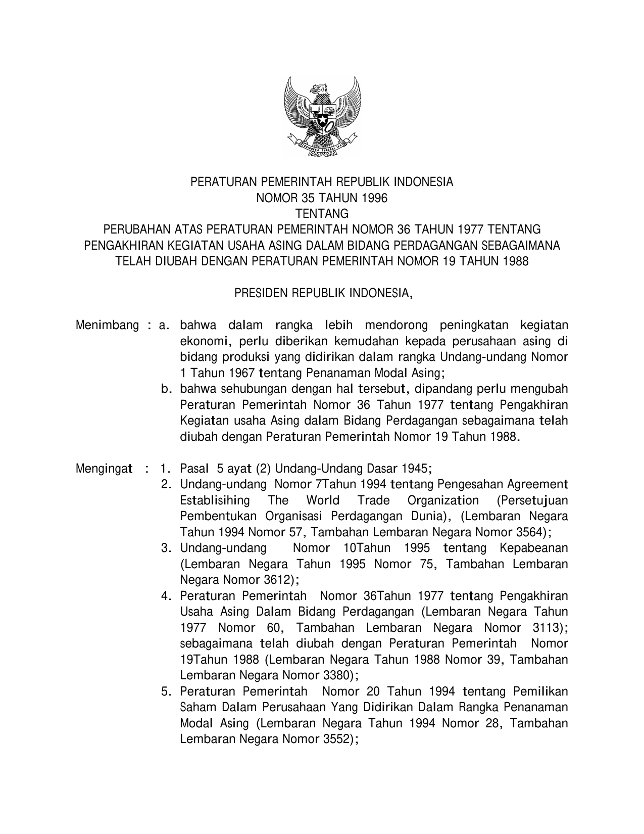 PP Nomor 35 Tahun 1996 | Peraturan Pemerintah Nomor 35 Tahun 1996 tentang PERUBAHAN PP 36-1997 TENTANG PENGAKHIRAN KEGIATAN USAHA ASING DALAM BIDANG PERDAGANGAN SEBAGAIMANA TELAH DIUBAH DENGAN PP 19-1988