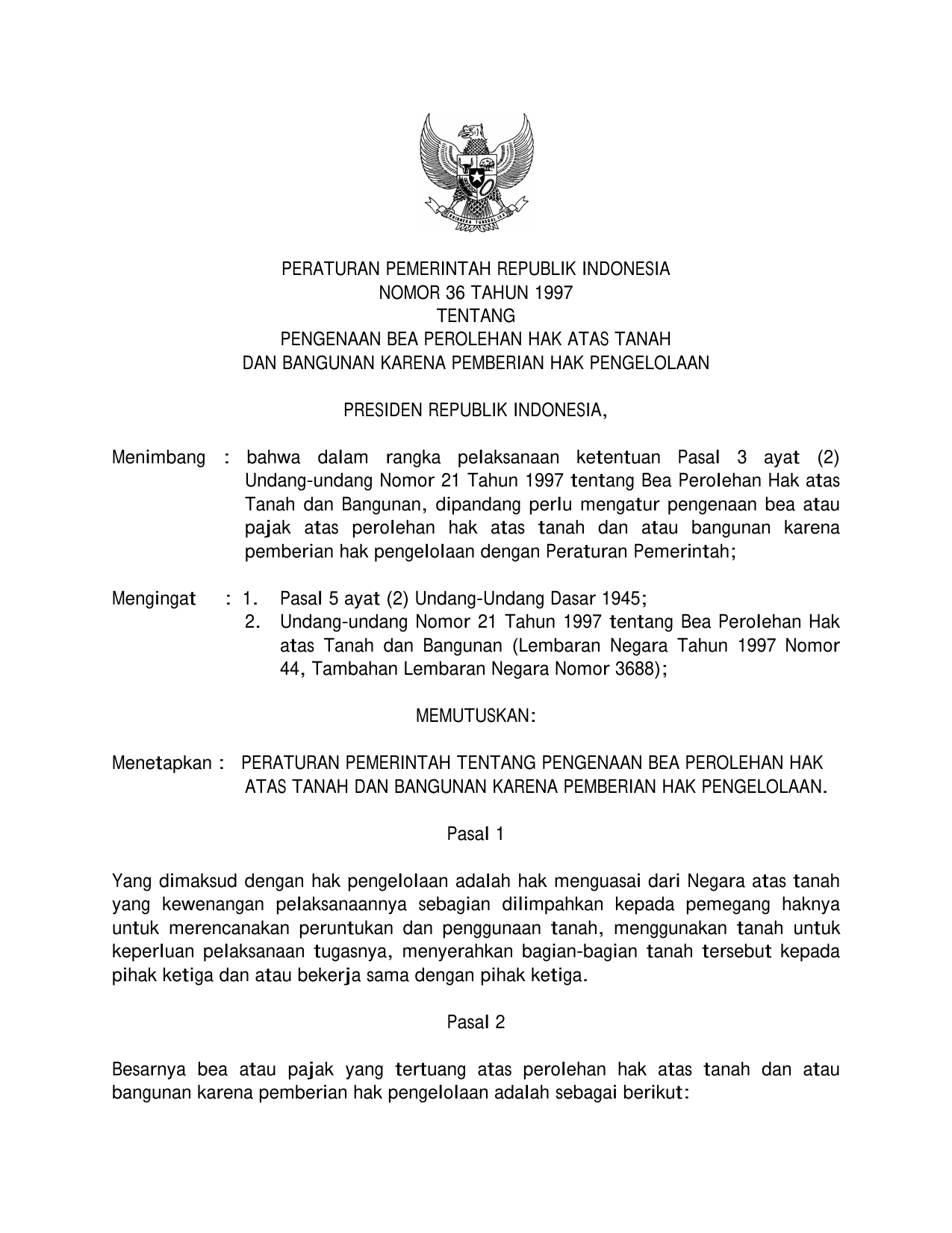 PP Nomor 36 Tahun 1997 | Peraturan Pemerintah Nomor 36 Tahun 1997 tentang PENGENAAN BEA PEROLEHAN HAK ATAS TANAH DAN BANGUNAN KARENA PEMBERIAN HAK PENGELOLAAN