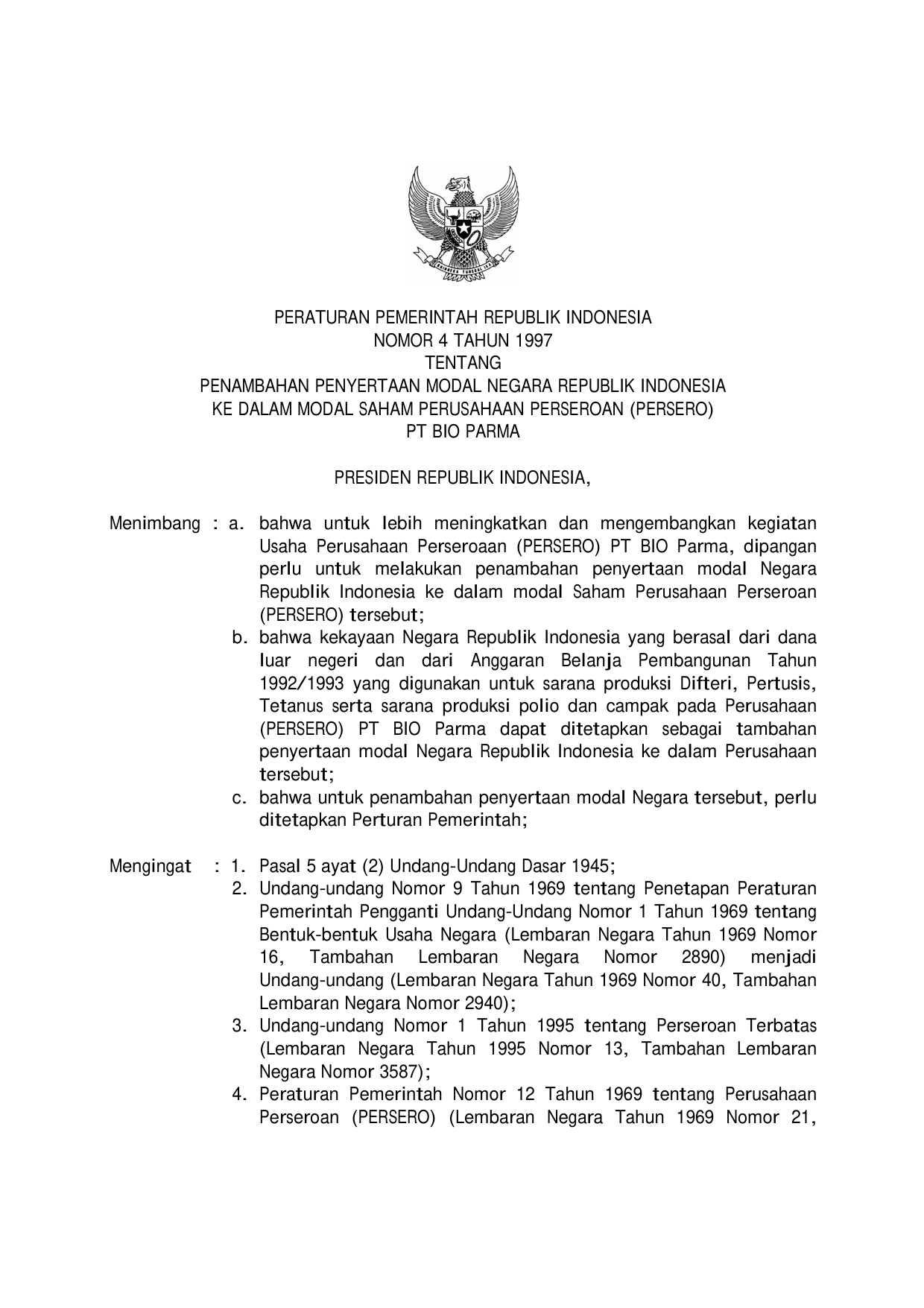 PP Nomor 4 Tahun 1997 | Peraturan Pemerintah Nomor 4 Tahun 1997 tentang PENAMBAHAN PENYERTAAN MODAL NEGARA RI KE DALAM MODAL SAHAM PERUSAHAAN PERSEROAN (PERSERO) BIO FARMA