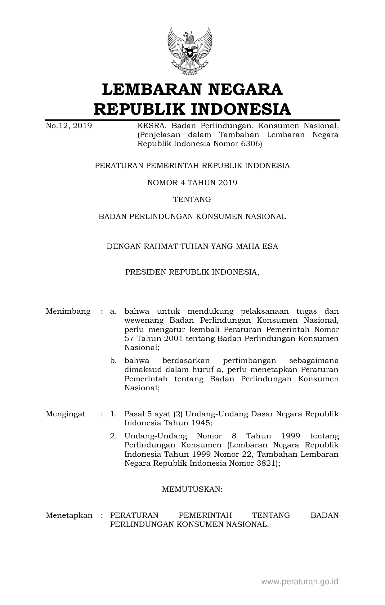 PP Nomor 4 Tahun 2019 | Peraturan Pemerintah Nomor 4 Tahun 2019 tentang BADAN PERLINDUNGAN KONSUMEN NASIONAL