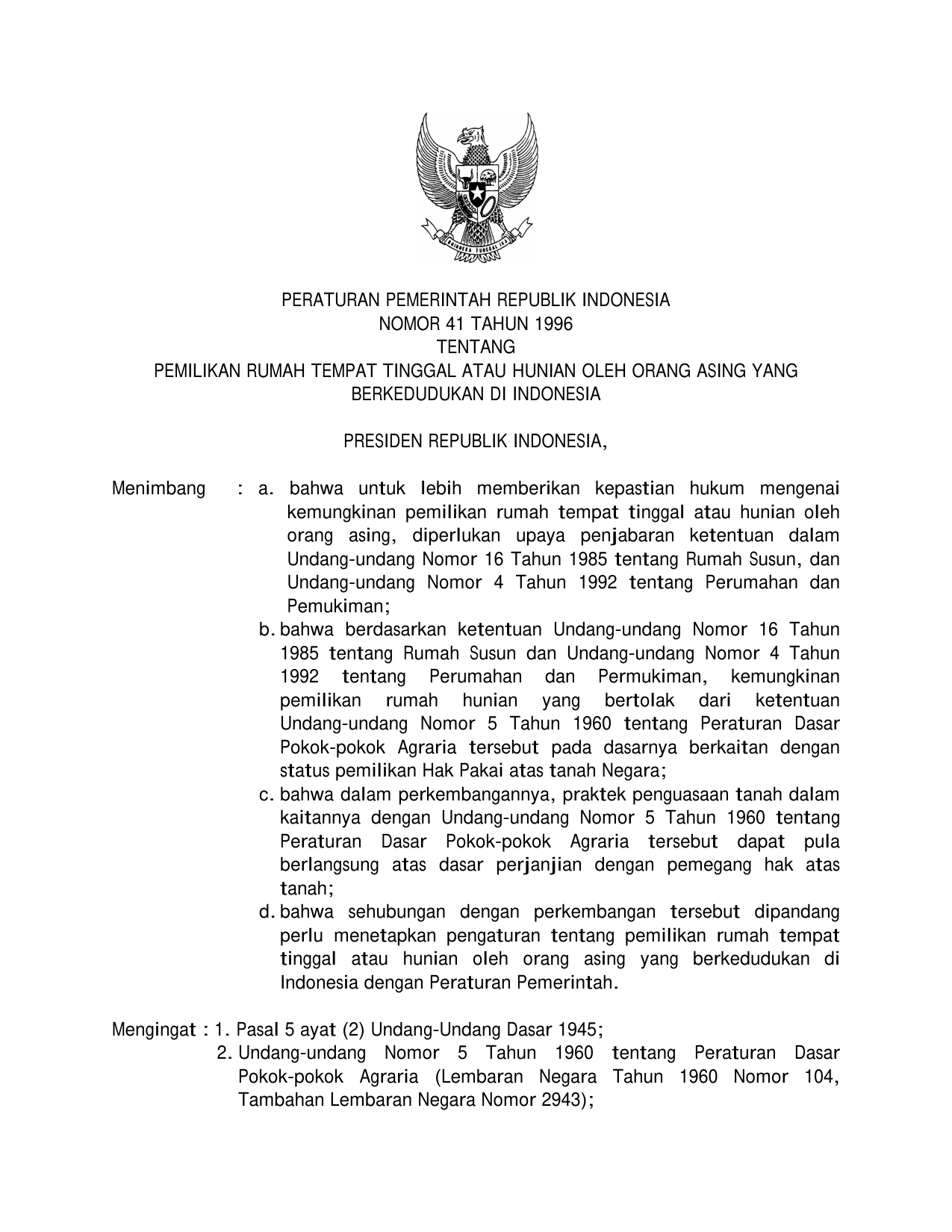 PP Nomor 41 Tahun 1996 | Peraturan Pemerintah Nomor 41 Tahun 1996 tentang PEMILIKAN RUMAH TEMPAT TINGGAL ATAU HUNIAN OLEH ORANG ASING YANG BERKEDUDUKAN DI INDONESIA