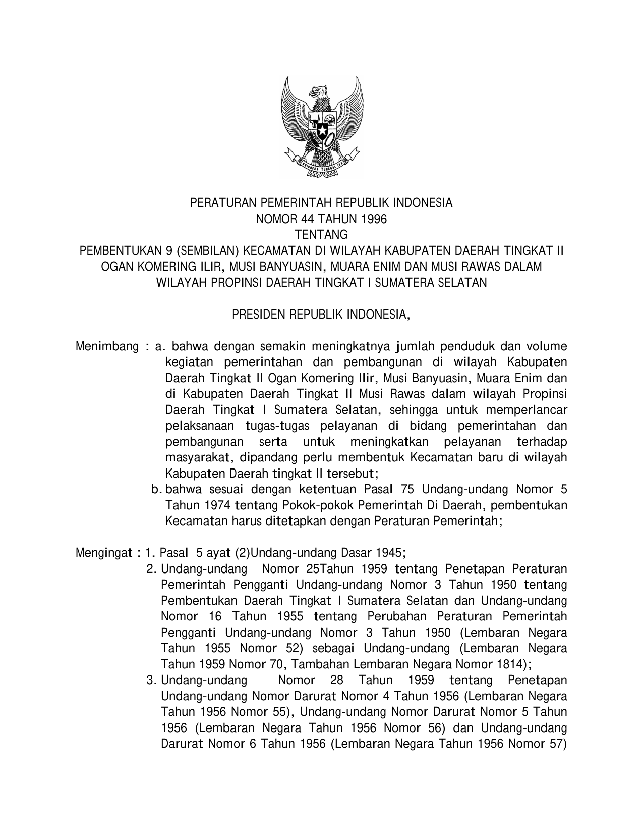 PP Nomor 44 Tahun 1996 | Peraturan Pemerintah Nomor 44 Tahun 1996 tentang PEMBENTUKAN 9 (SEMBILAN) KECAMATAN DI WILAYAH KABUPATEN DATI II OGAN KOMERING ILIR, MUSI BANYUASIN, MUARA ENIM, DAN MUSI RAWAS DALAM WILAYAH PROPINSI DATI I SUMATERA SELATAN