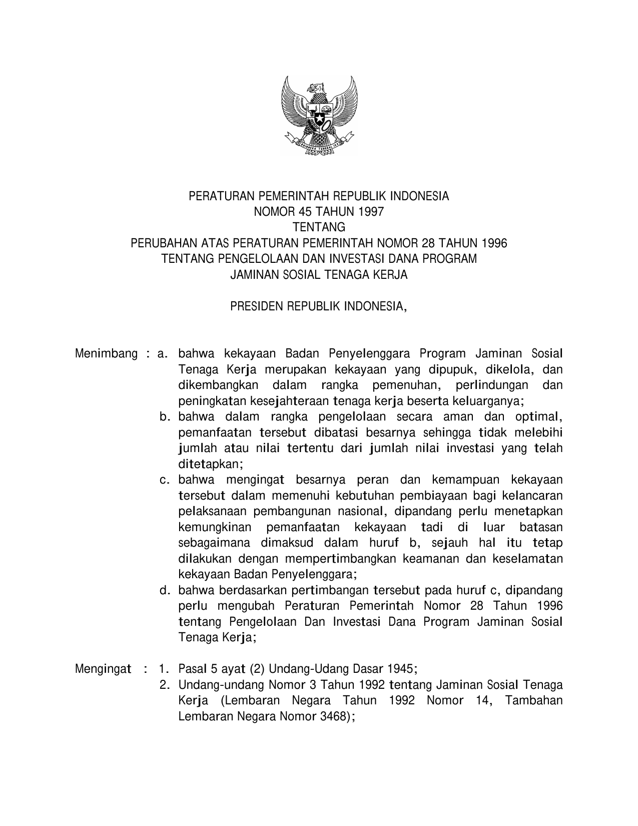 PP Nomor 45 Tahun 1997 | Peraturan Pemerintah Nomor 45 Tahun 1997 tentang PERUBAHAN PP 28-1996 TENTANG PENGELOLAAN DAN INVESTASI DANA PROGRAM JAMINAN SOSIAL TENAGA KERJA