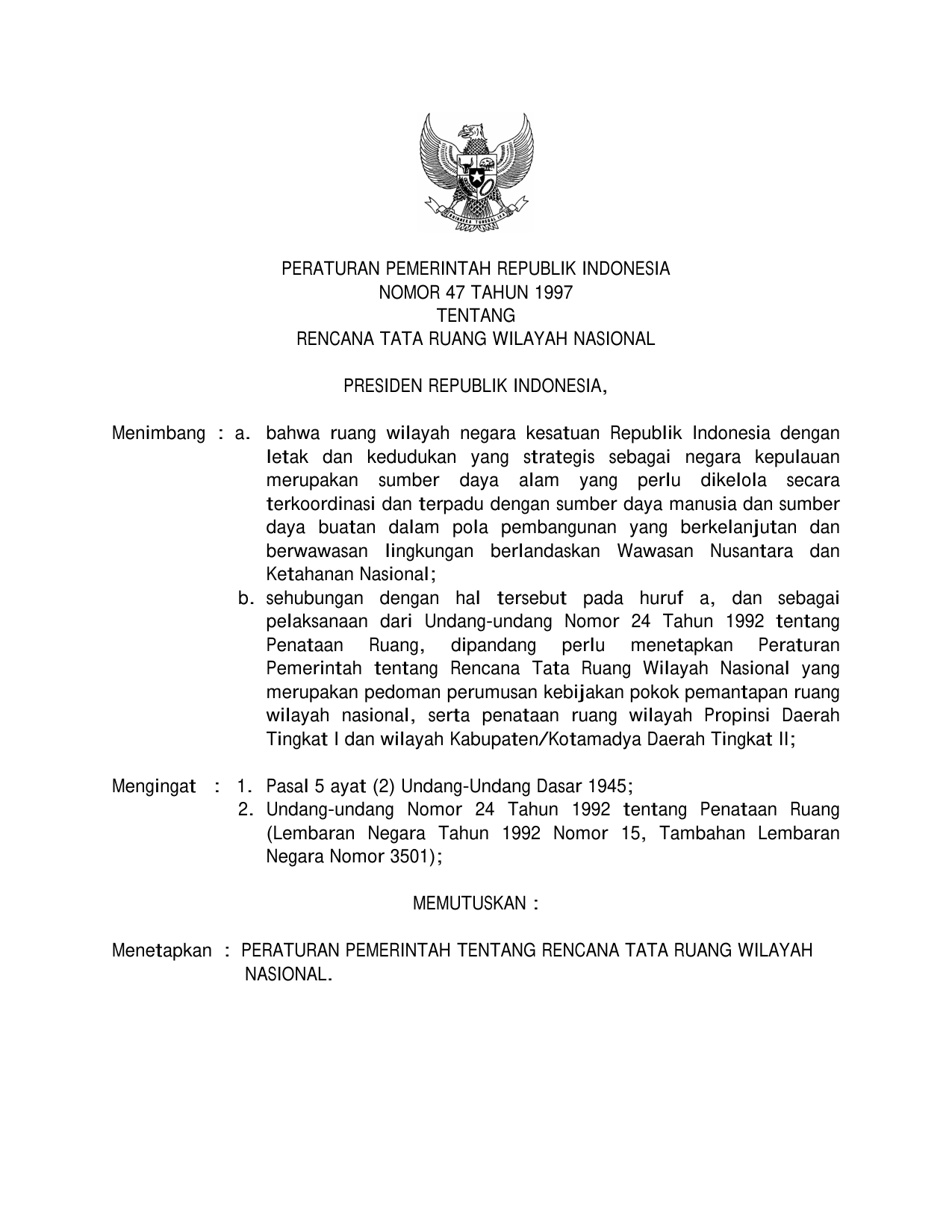 PP Nomor 47 Tahun 1997 | Peraturan Pemerintah Nomor 47 Tahun 1997 tentang RENCANA TATA RUANG WILAYAH NASIONAL