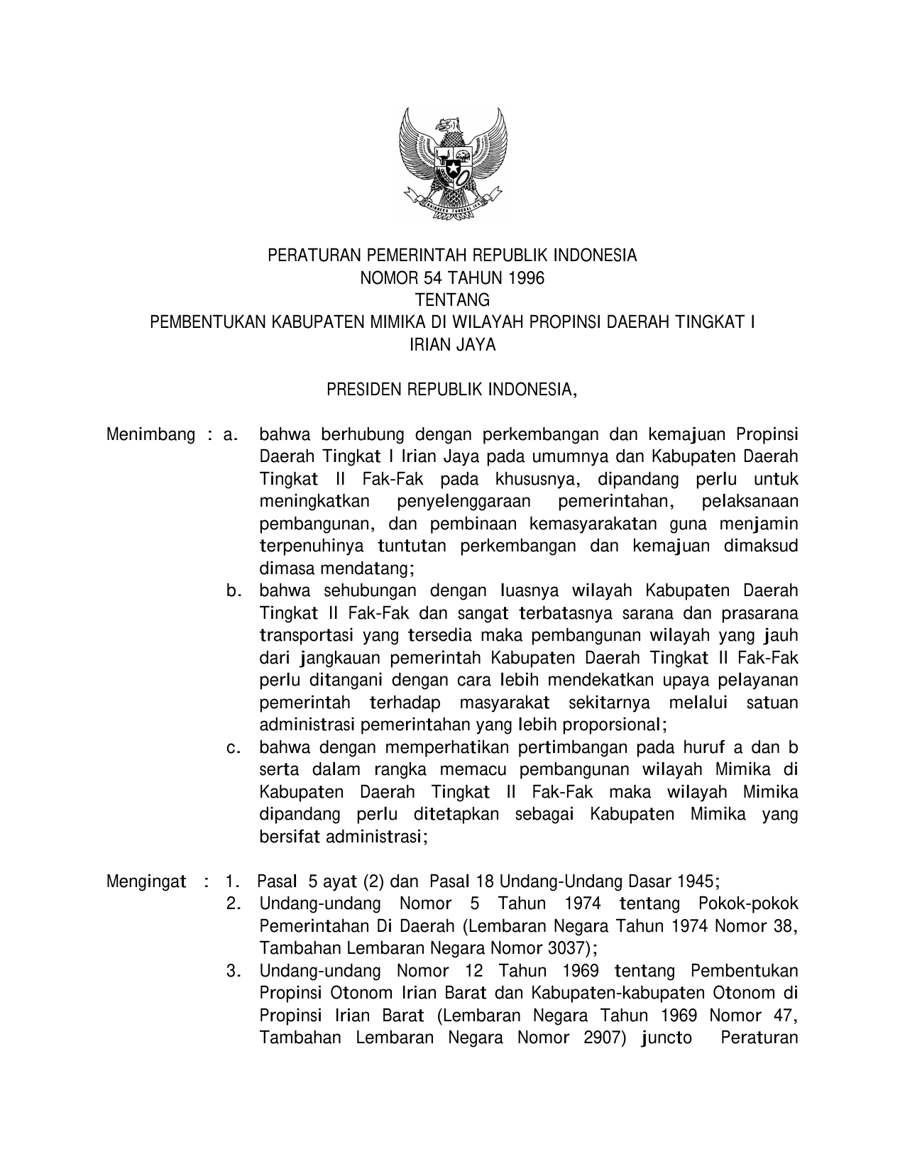 PP Nomor 54 Tahun 1996 | Peraturan Pemerintah Nomor 54 Tahun 1996 tentang PEMBENTUKAN KABUPATEN MIMIKA DI WILAYAH PROPINSI DAERAH TINGKAT I IRIAN JAYA