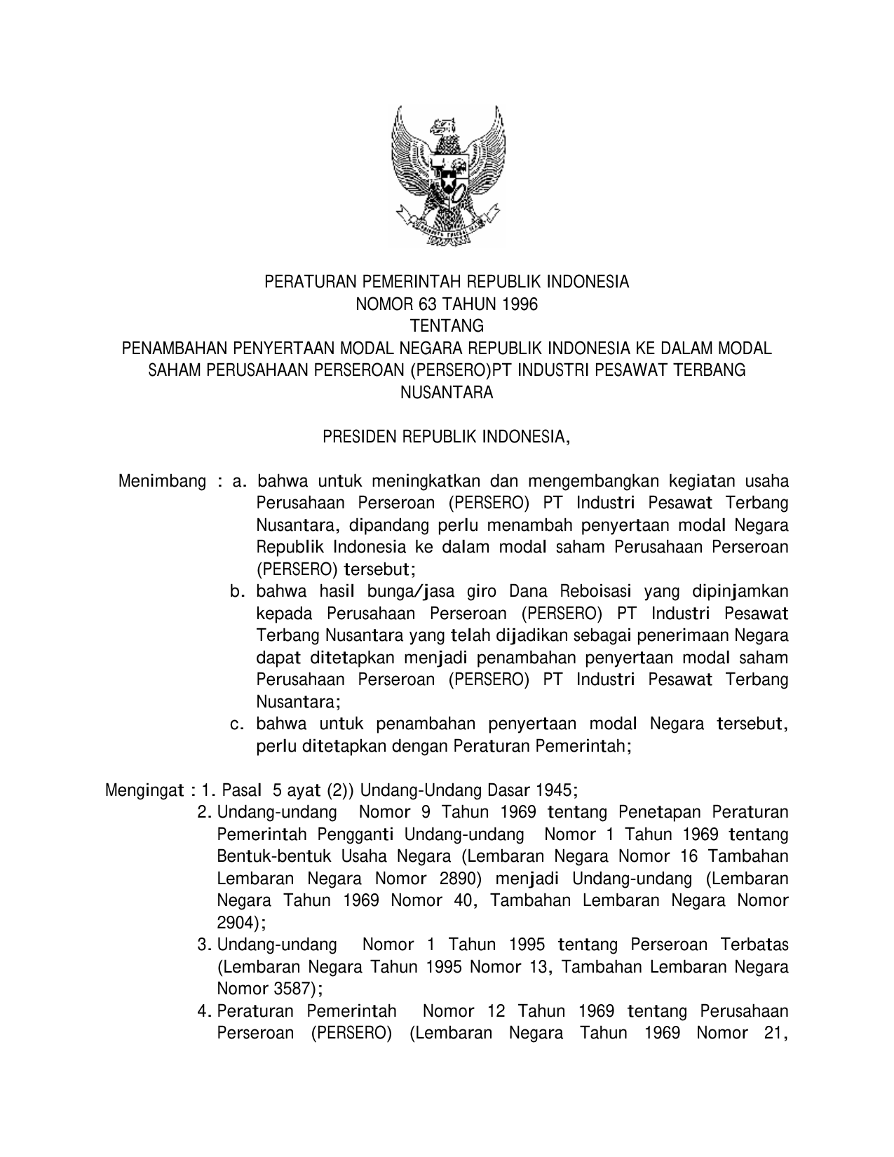 PP Nomor 63 Tahun 1996 | Peraturan Pemerintah Nomor 63 Tahun 1996 tentang PENAMBAHAN PENYERTAAN MODAL NEGARA RI KE DALAM MODAL SAHAM PERUSAHAAN PERSEROAN (PERSERO) PT INDUSTRI PESAWAT TERBANG NUSANTARA