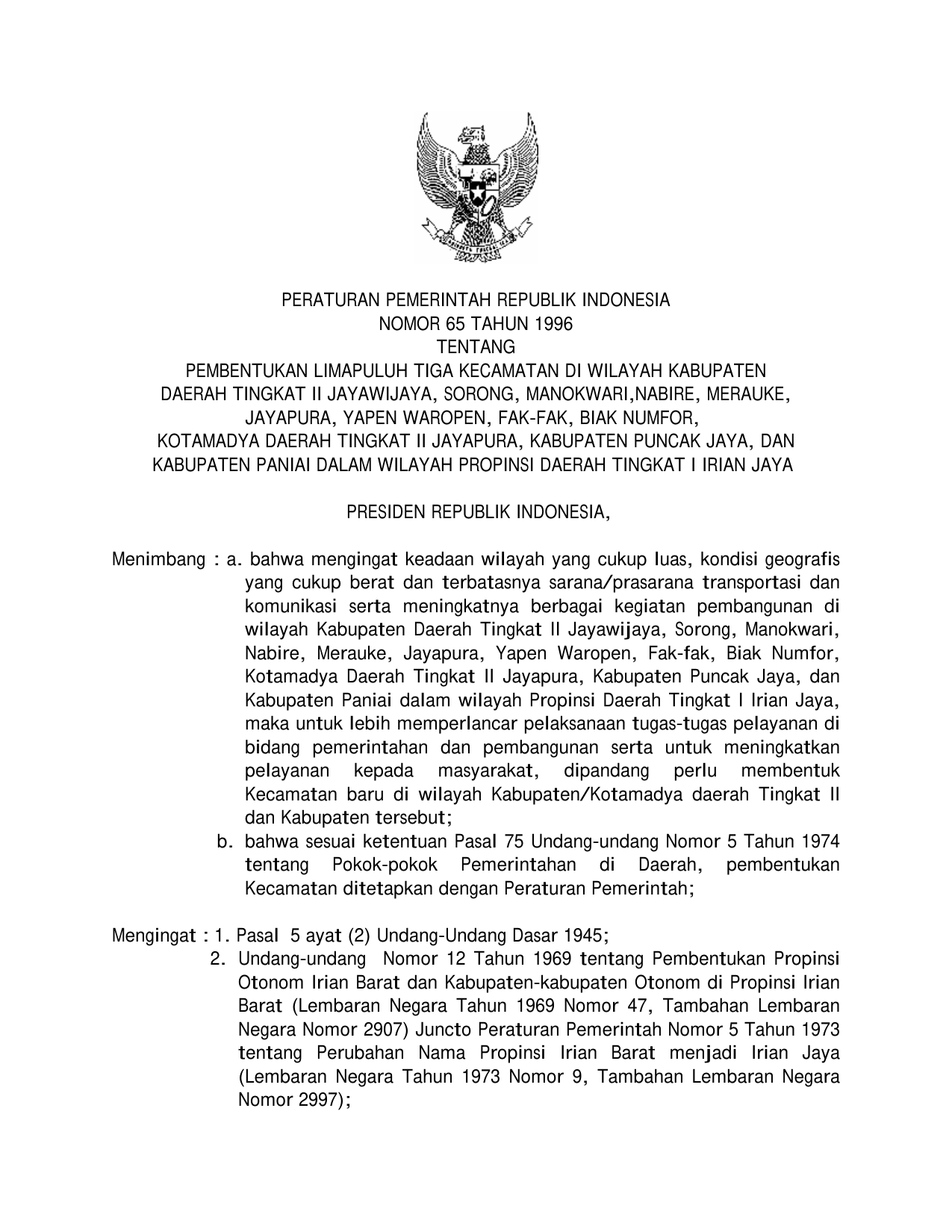 PP Nomor 65 Tahun 1996 | Peraturan Pemerintah Nomor 65 Tahun 1996 tentang PEMBENTUKAN LIMA PULUH TIGA KECAMATAN DI WILAYAH KABUPATEN DATI II JAYA WIJAYA, SORONG, MANOKWARI, NABIRE, MERAUKE, JAYAPURA, YAPEN, WAROPEN, FAK-FAK, BIAK NUMFOR, KOTAMADYA DATI II JAYAPURA, KABUPATEN PUNCAK JAYA, DAN KABUPATEN PAWIAI DALAM WILAYAH PROVINSI DATI I IRIAN JAYA