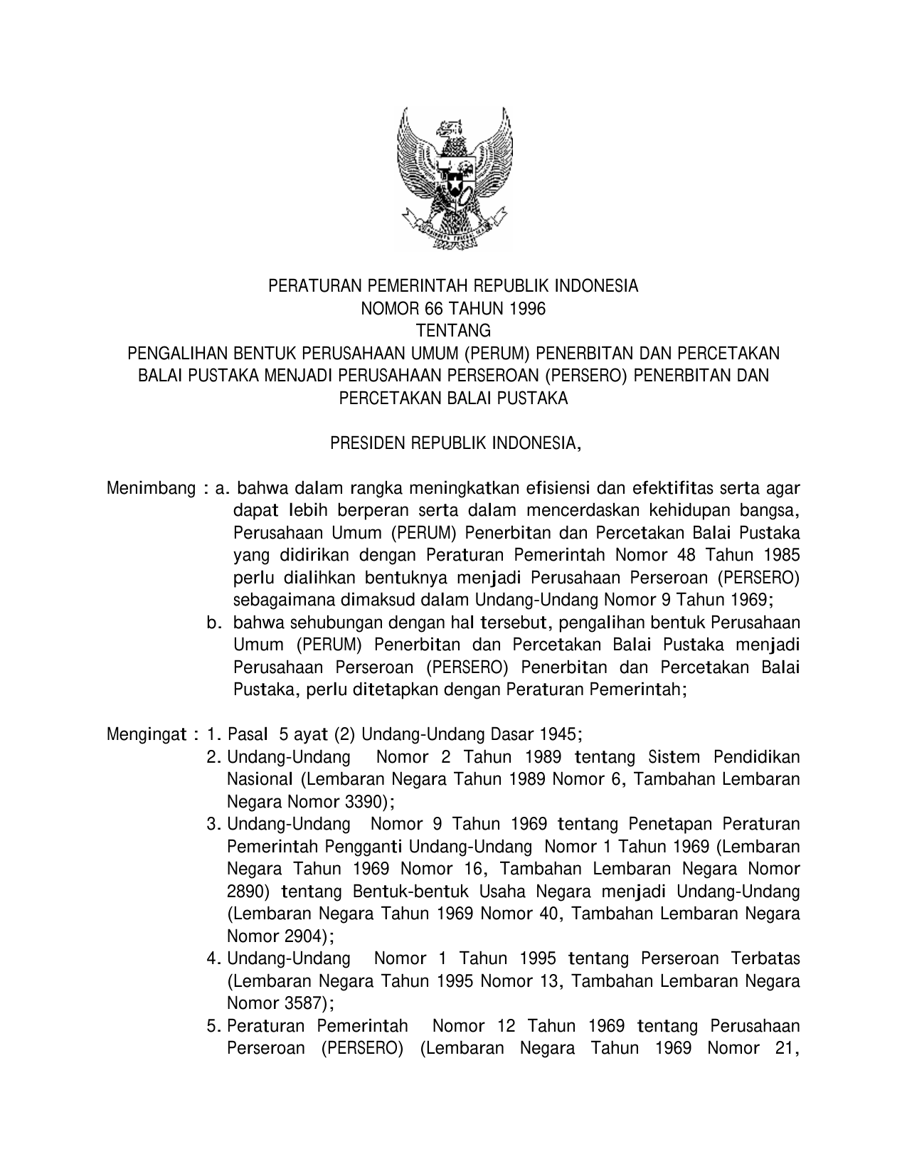 PP Nomor 66 Tahun 1996 | Peraturan Pemerintah Nomor 66 Tahun 1996 tentang PENGALIHAN BENTUK PERUSAHAAN UMUM (PERUM) PENERBITAN DAN PERCETAKAN BALAI PUSTAKA MENJADI PERUSAHAAN PERSEROAN (PERSERO) PENERBITAN DAN PERCETAKAN BALAI PUSTAKA