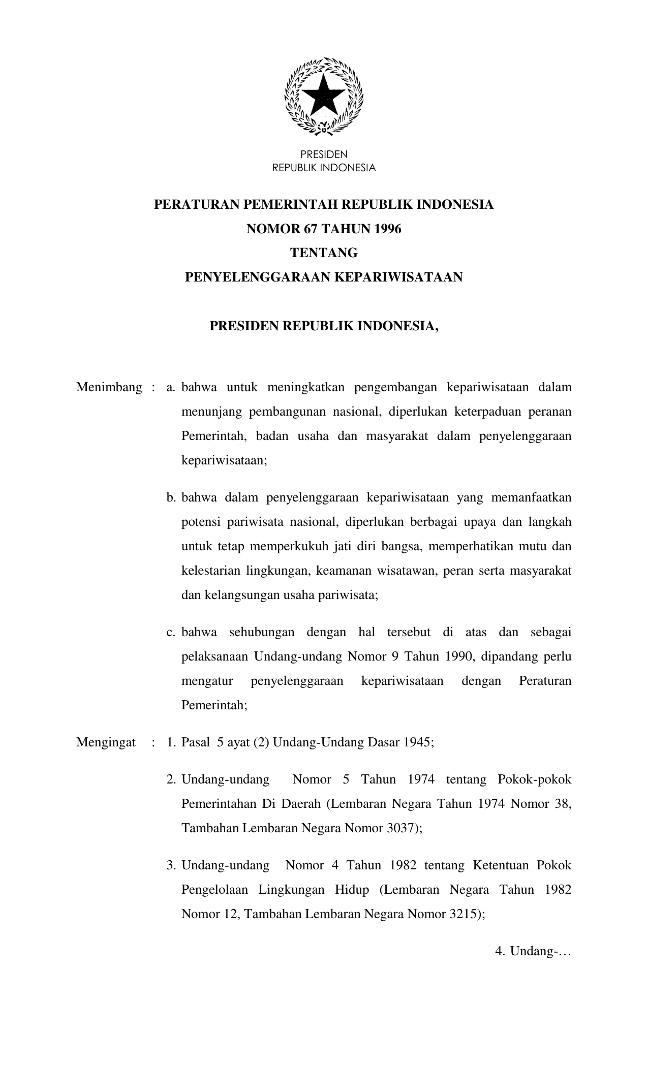 PP Nomor 67 Tahun 1996 | Peraturan Pemerintah Nomor 67 Tahun 1996 tentang PENYELENGGARAAN KEPARIWISATAAN