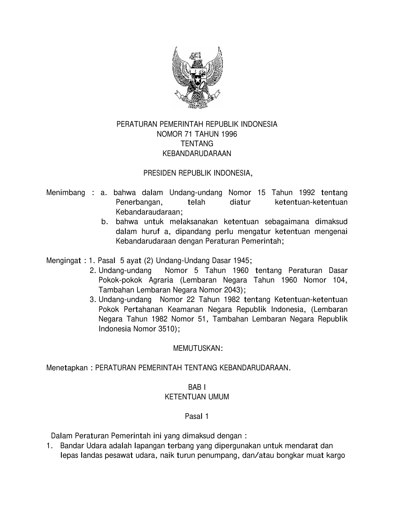 PP Nomor 71 Tahun 1996 | Peraturan Pemerintah Nomor 71 Tahun 1996 tentang KEBANDARUDARAAN