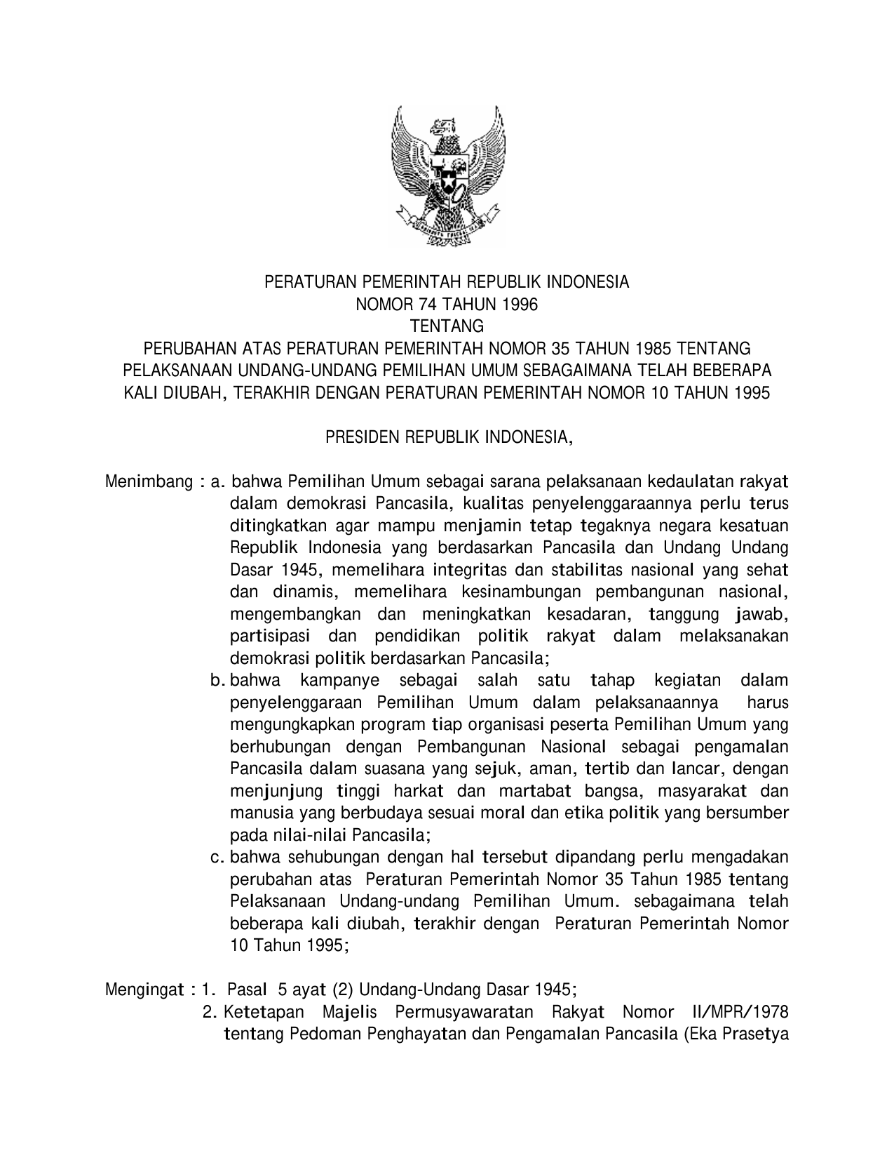 PP Nomor 74 Tahun 1996 | Peraturan Pemerintah Nomor 74 Tahun 1996 tentang PERUBAHAN PP 35-1985 TENTANG PELAKSANAAN UU PEMILIHAN UMUM SEBAGAIMANA TELAH BEBERAPA KALI DIUBAH TERAKHIR DENGAN PP 10-1995